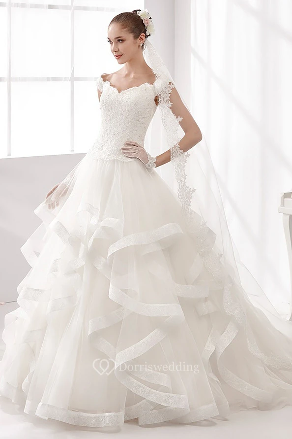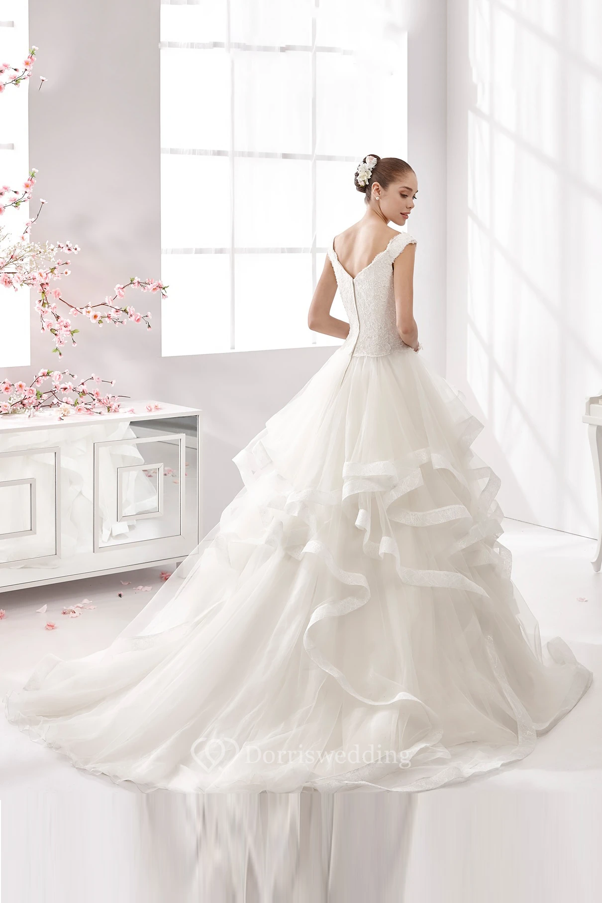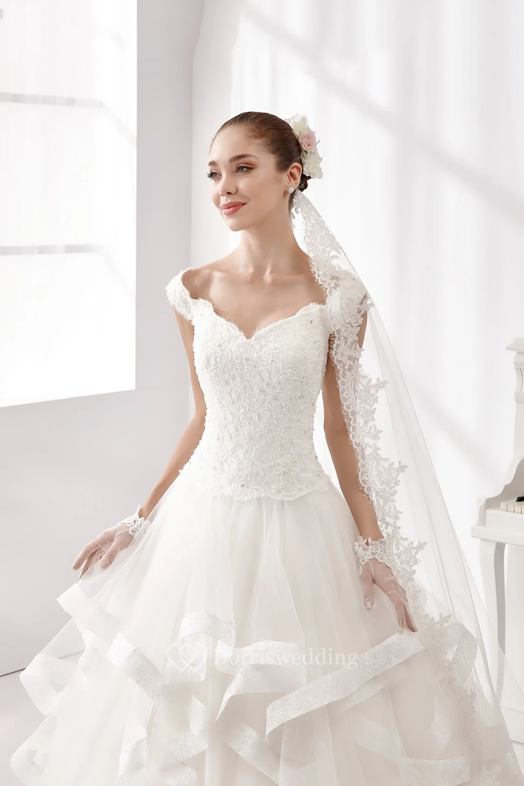 Cap-Sleeve A-Line Wedding Dress With Cascading Ruffles And Lace Corset