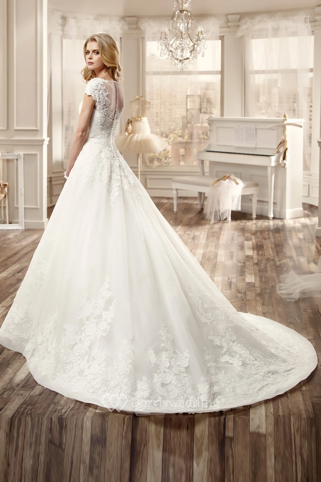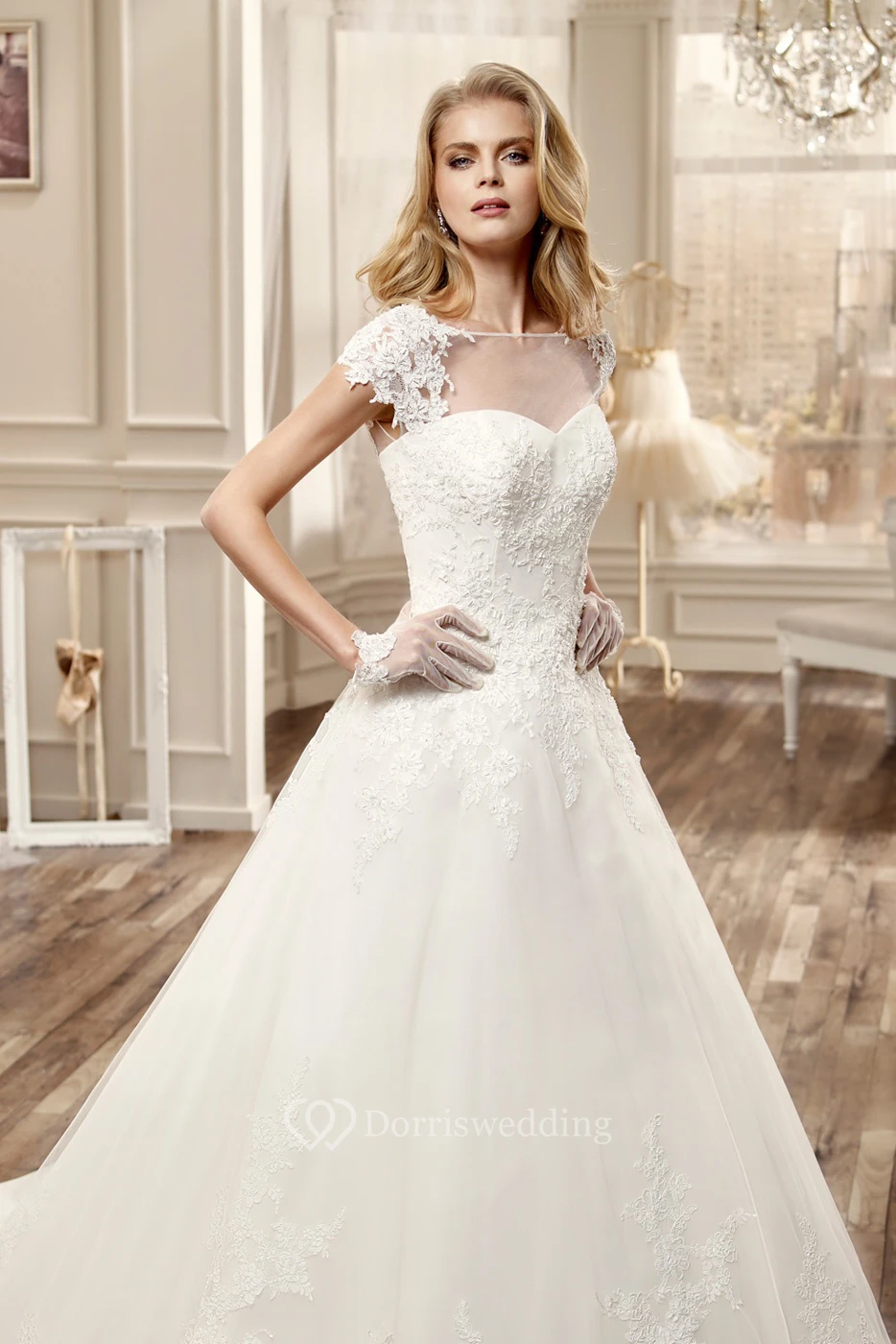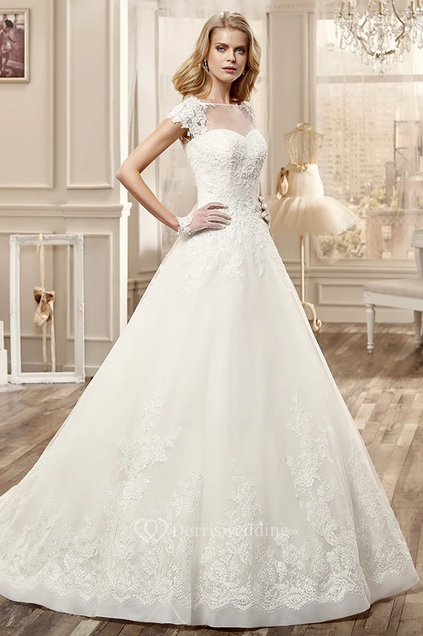 Cap-Sleeve A-Line Wedding Dress With Illusive Neckline And Embroidery