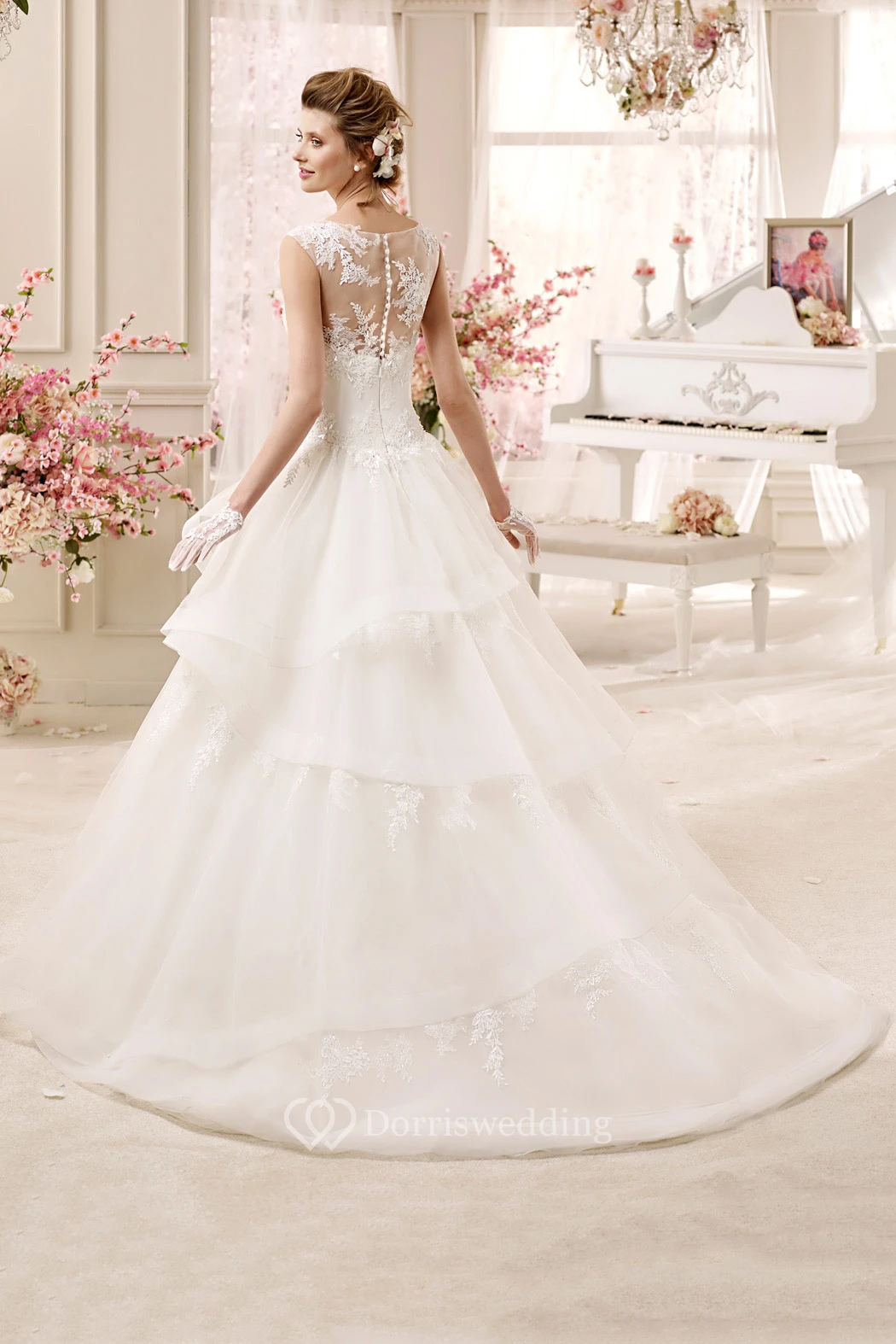 Cap sleeve A-line Wedding Dress with Tiers Skirt and Illusive Design