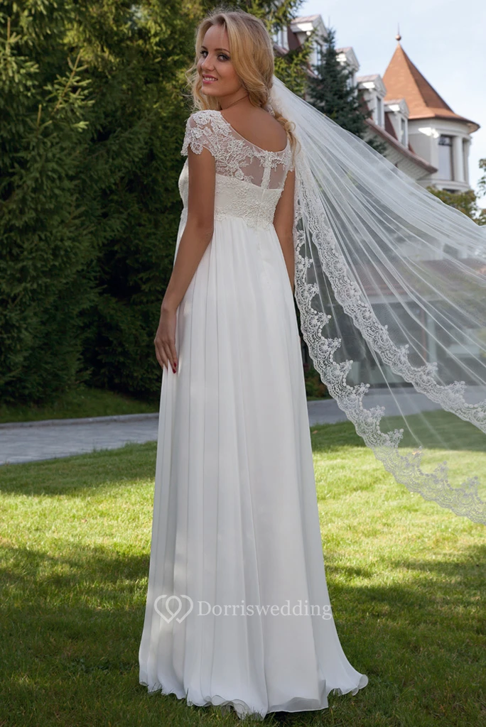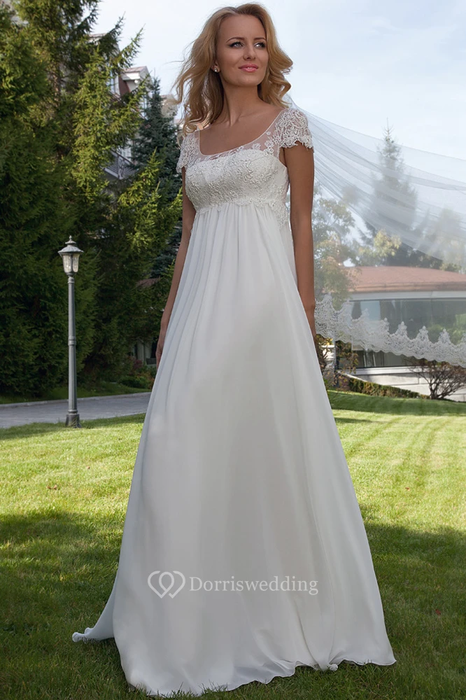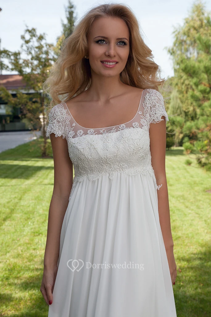 Cap Sleeve Appliqued Empire Scoop Neck Chiffon Wedding Dress