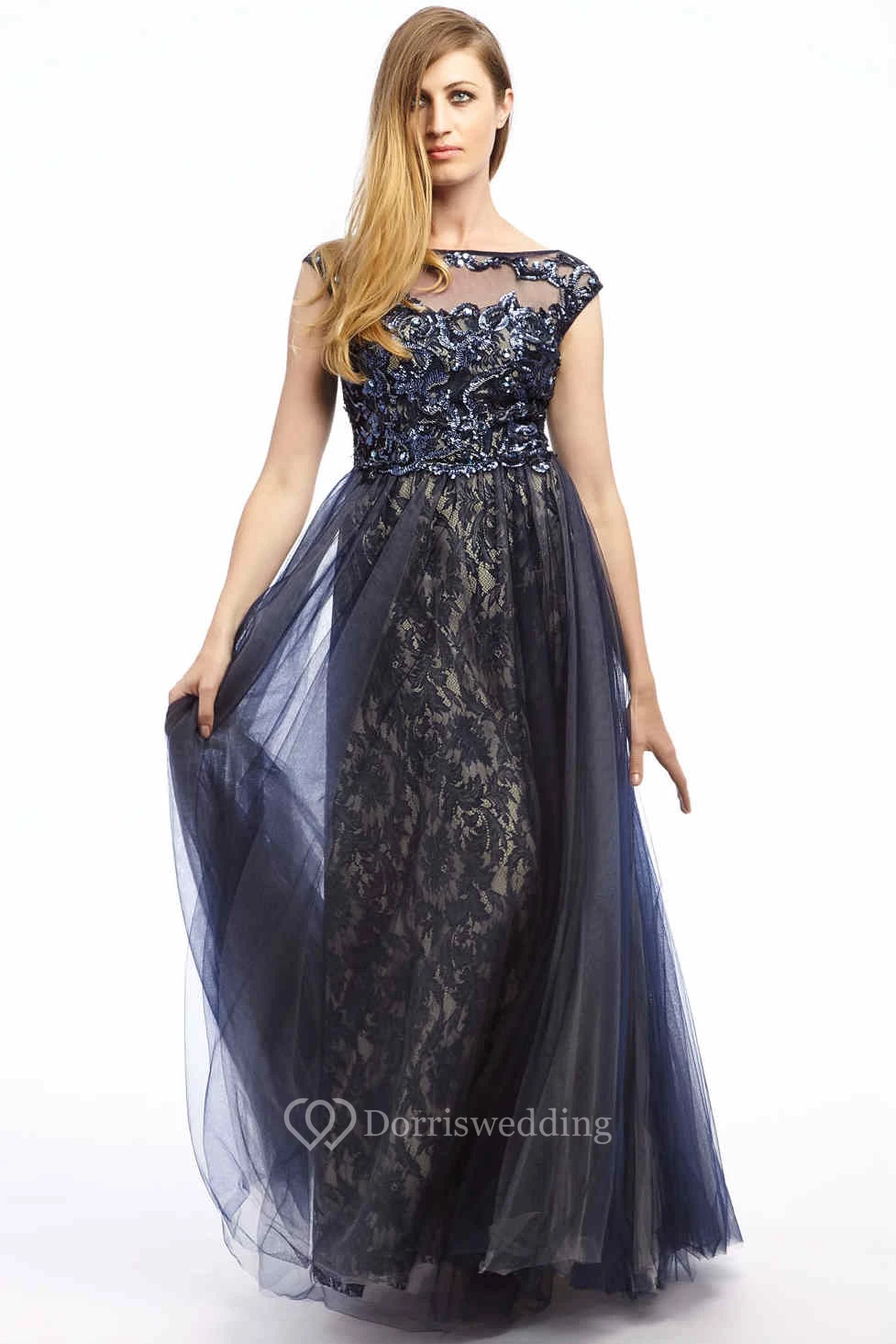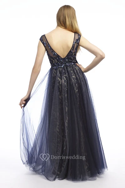 Cap-Sleeve Appliqued Floor-Length Bateau-Neck Tulle&Lace Prom Dress