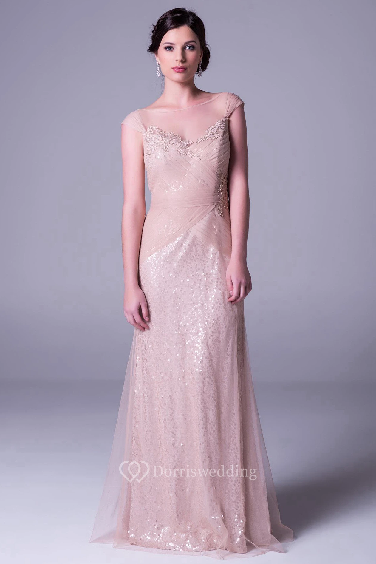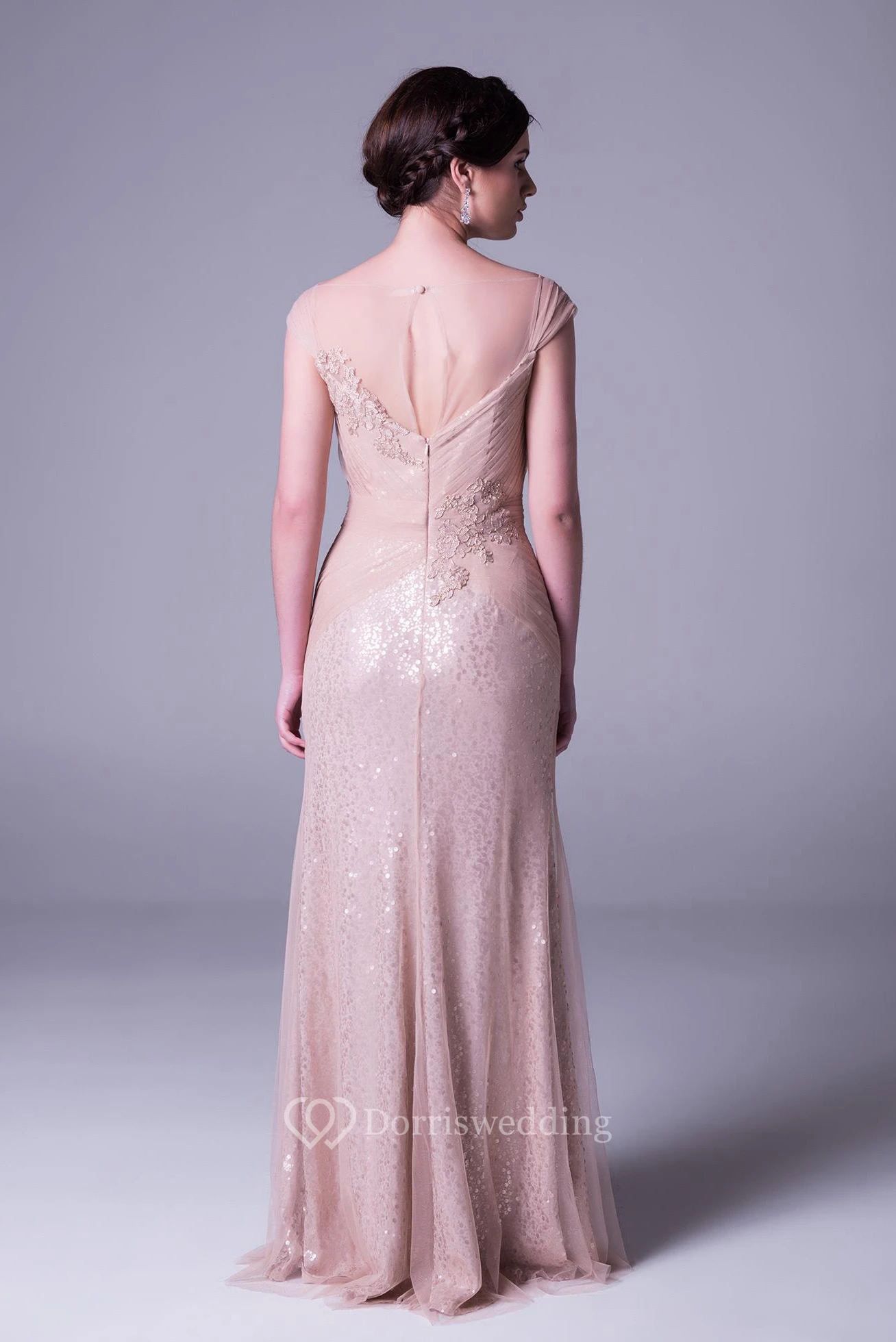 Cap Sleeve Bateau Neck Ruched Tulle Bridesmaid Dress With Illusion Back