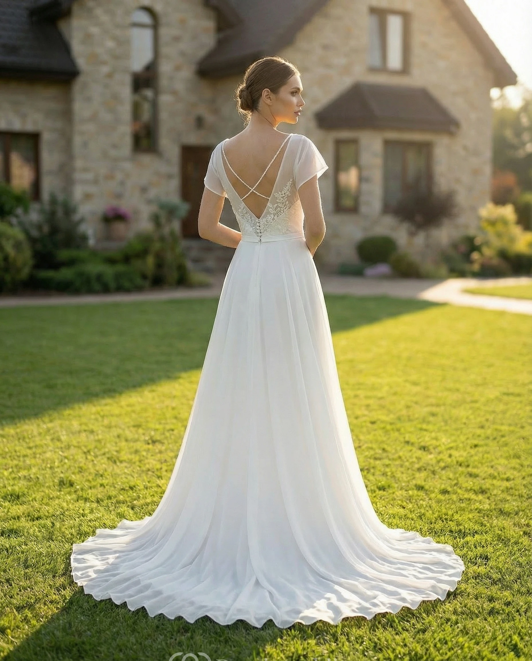 Cap Sleeve Chiffon A-Line Gown with Deep-V Back