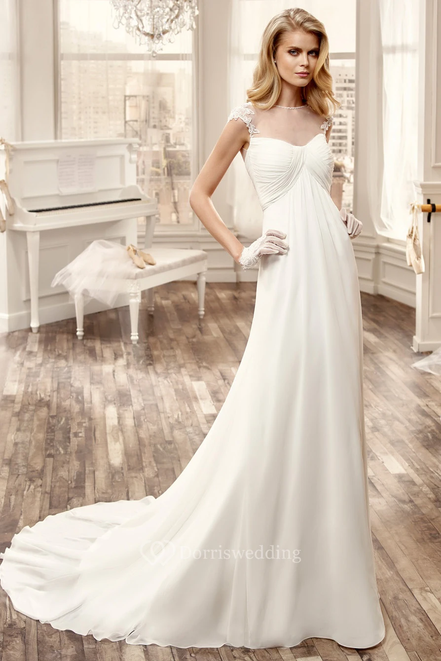Cap-Sleeve Chiffon Long Wedding Dress With Pleated Bust And Brush Train