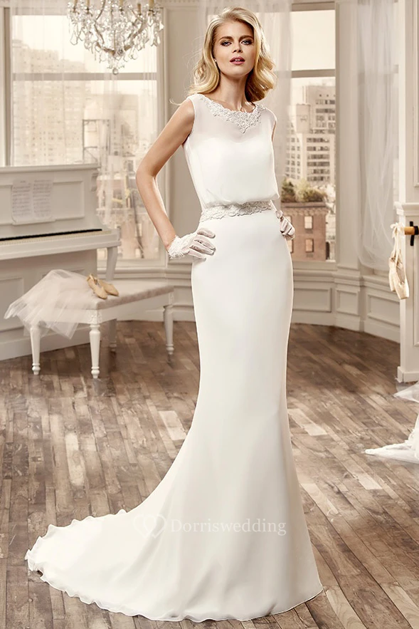Cap-Sleeve Chiffon Wedding Dress With Appliqued Neckline And Brush Train
