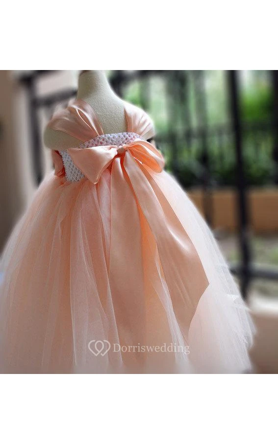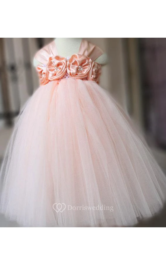 Cap Sleeve Empire Pleated Tulle Ball Gown With Flowers and Bow