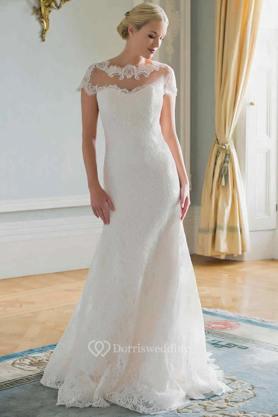 Cap-Sleeve High Neck Long Lace Wedding Dress