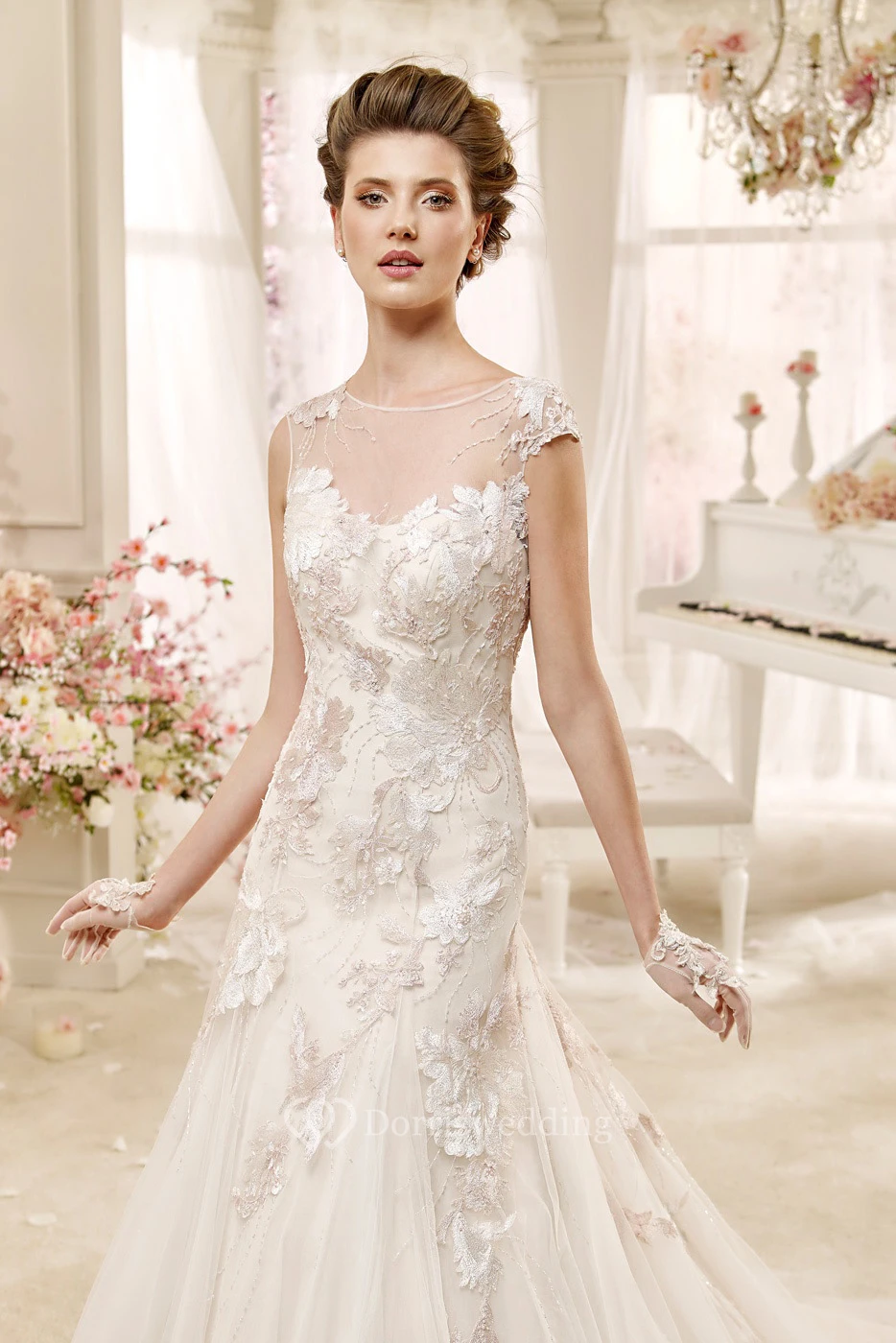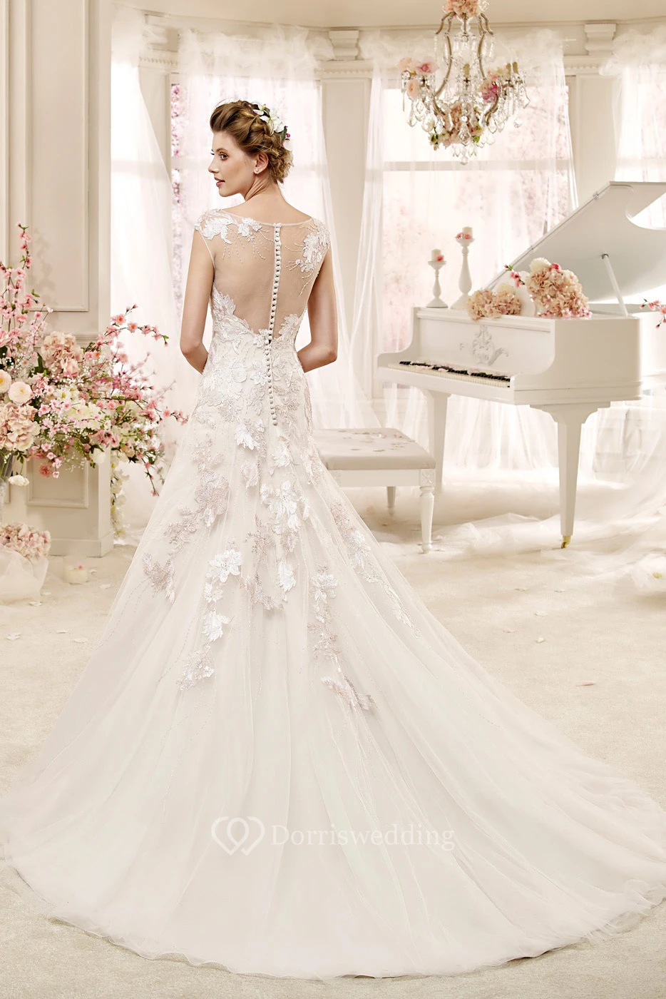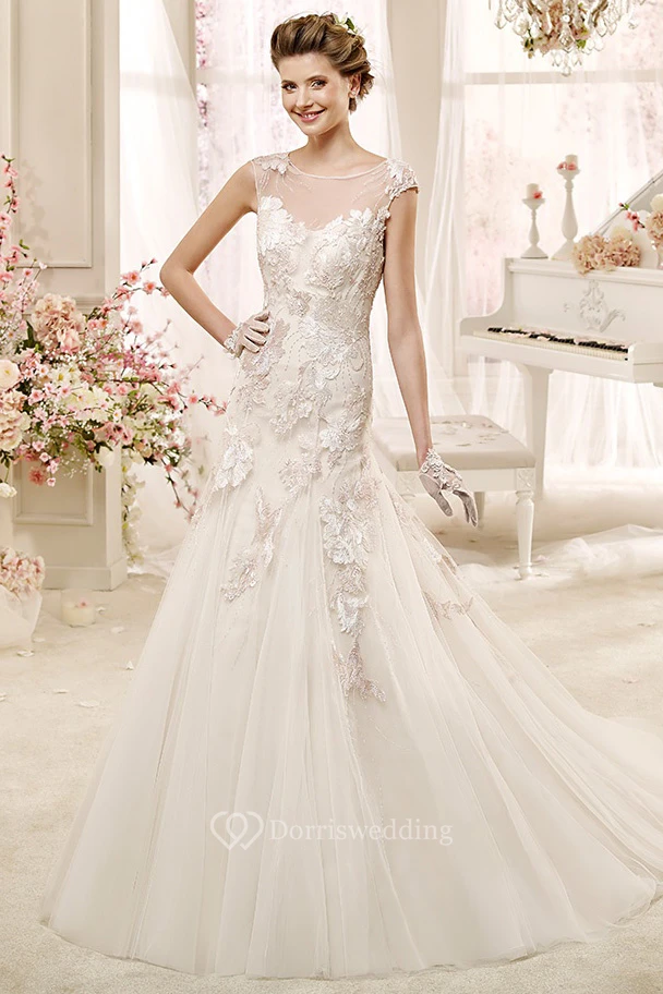 Cap sleeve Illusion Wedding Gown with Appliques and Court Train