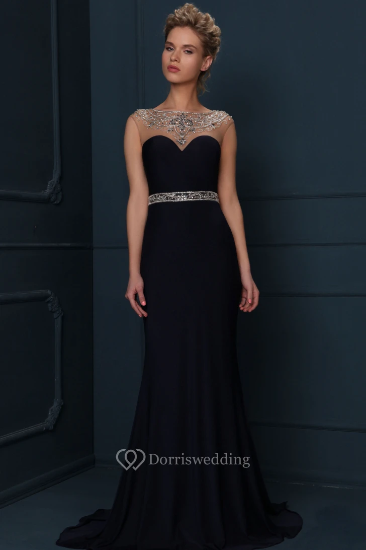 Cap Sleeve Jewel Neck Beaded Jersey Evening Dress
