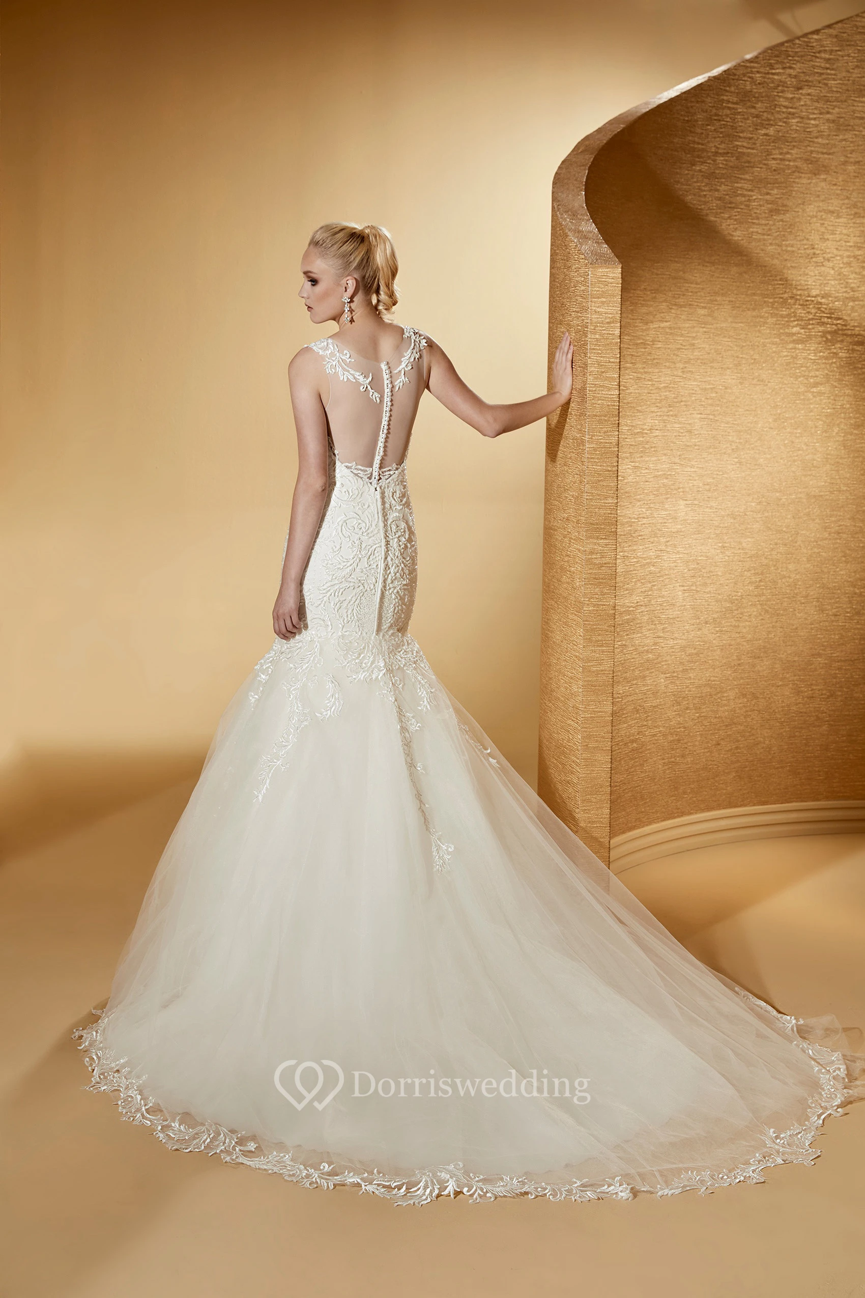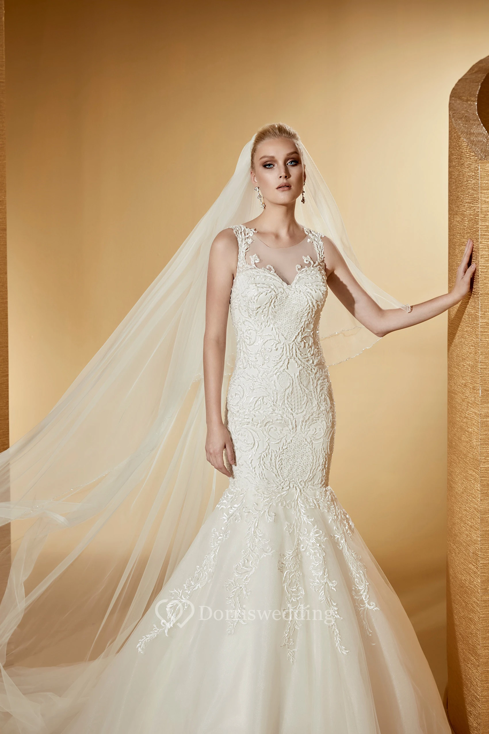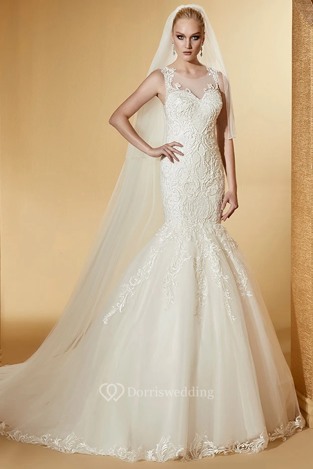 Cap Sleeve Jewel-Neck Mermaid Bridal Gown With Illusive Design And Court Train