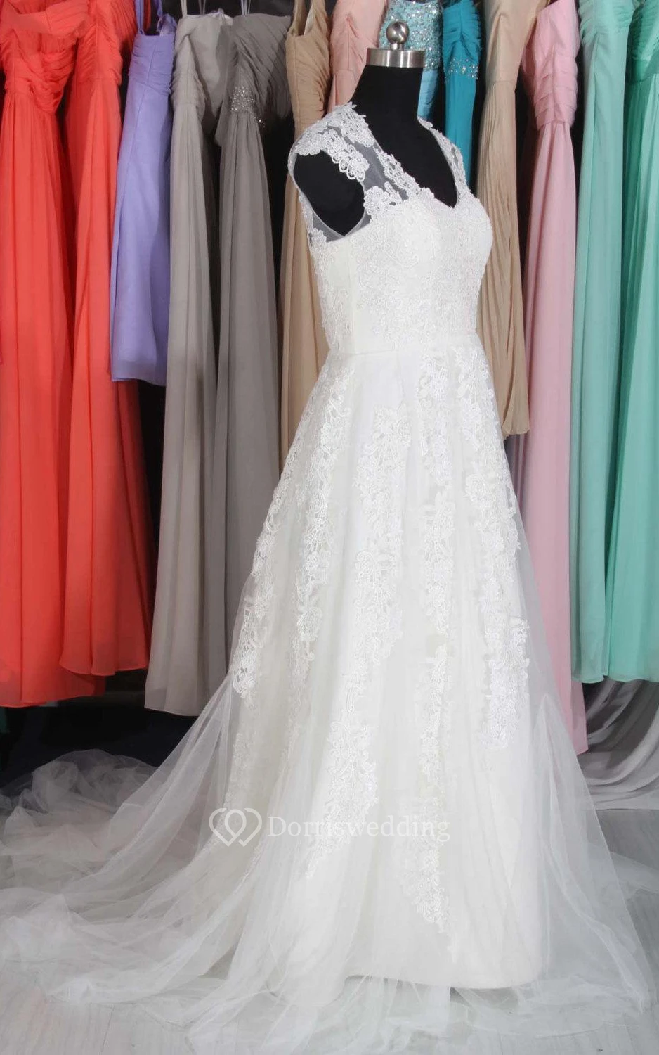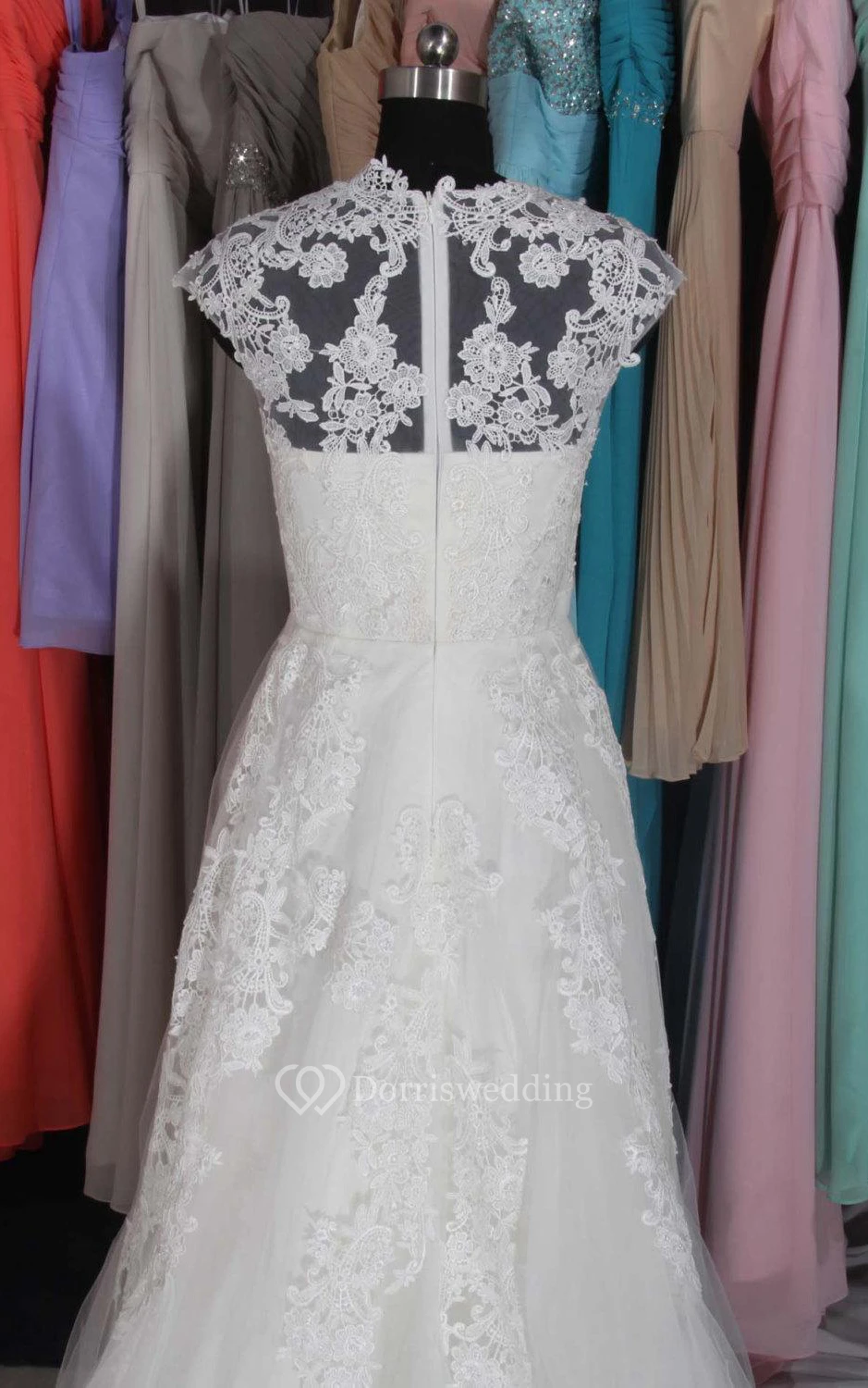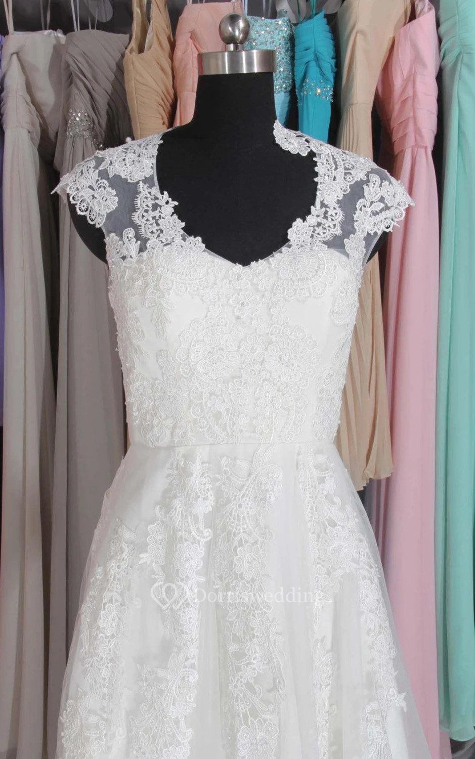 Cap Sleeve Lace A-Line V-Neck Dress With Illusion Back
