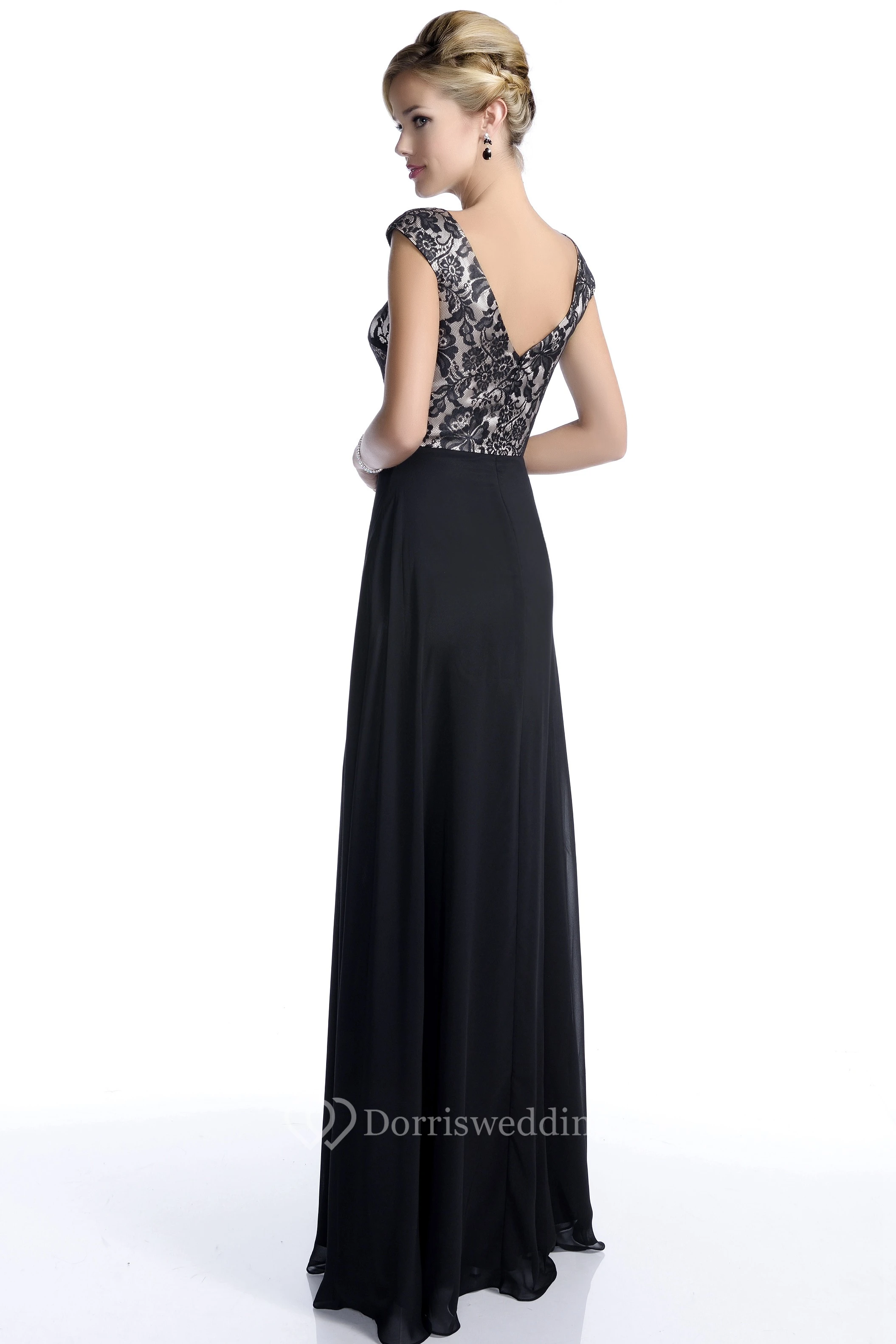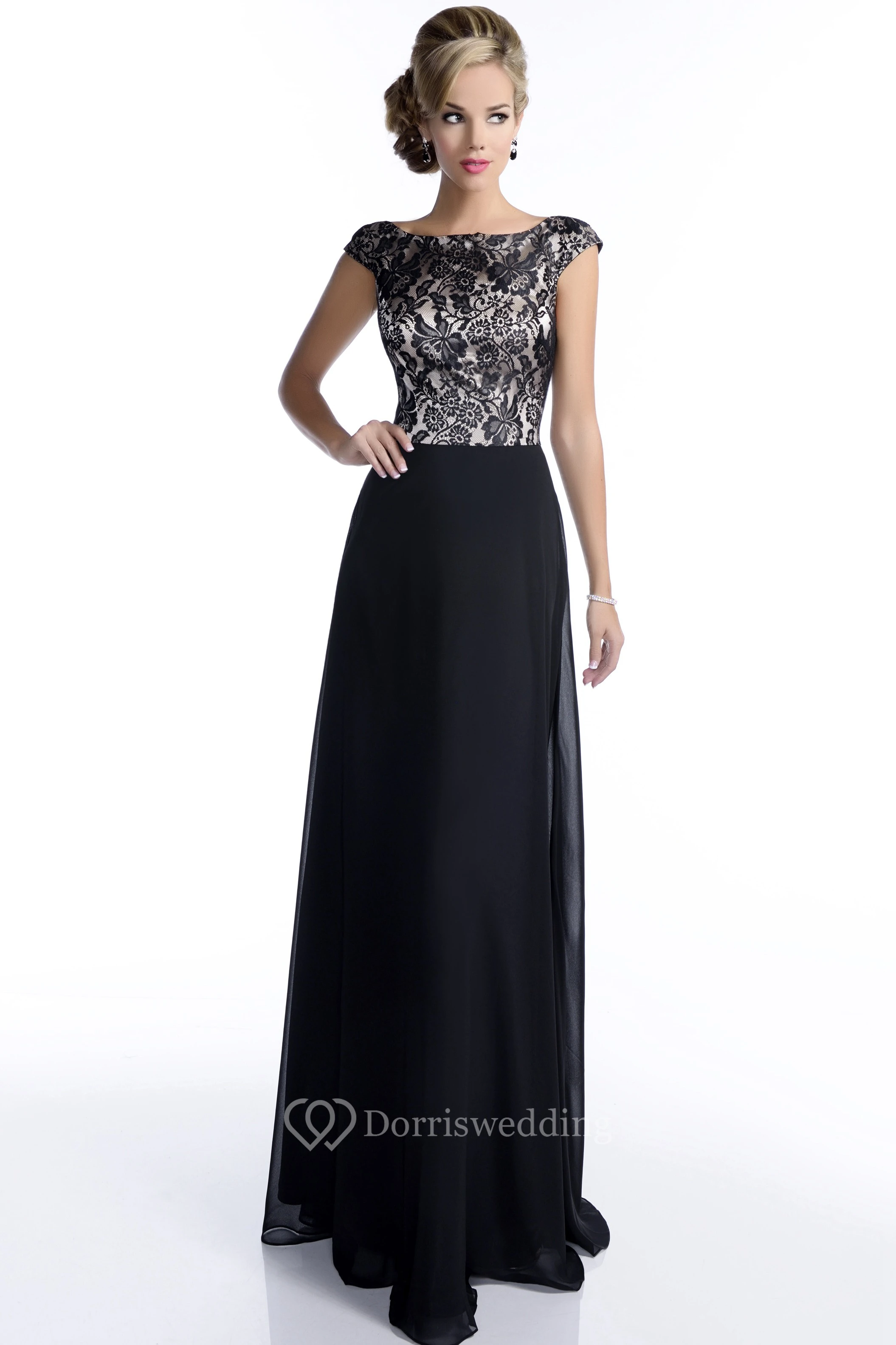 Cap Sleeve Lace And Chiffon Bridesmaid Dress With Bateau Neck And Low-V Back