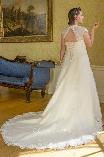 Cap Sleeve Lace Bridal Gown With Lace Up And Keyhole