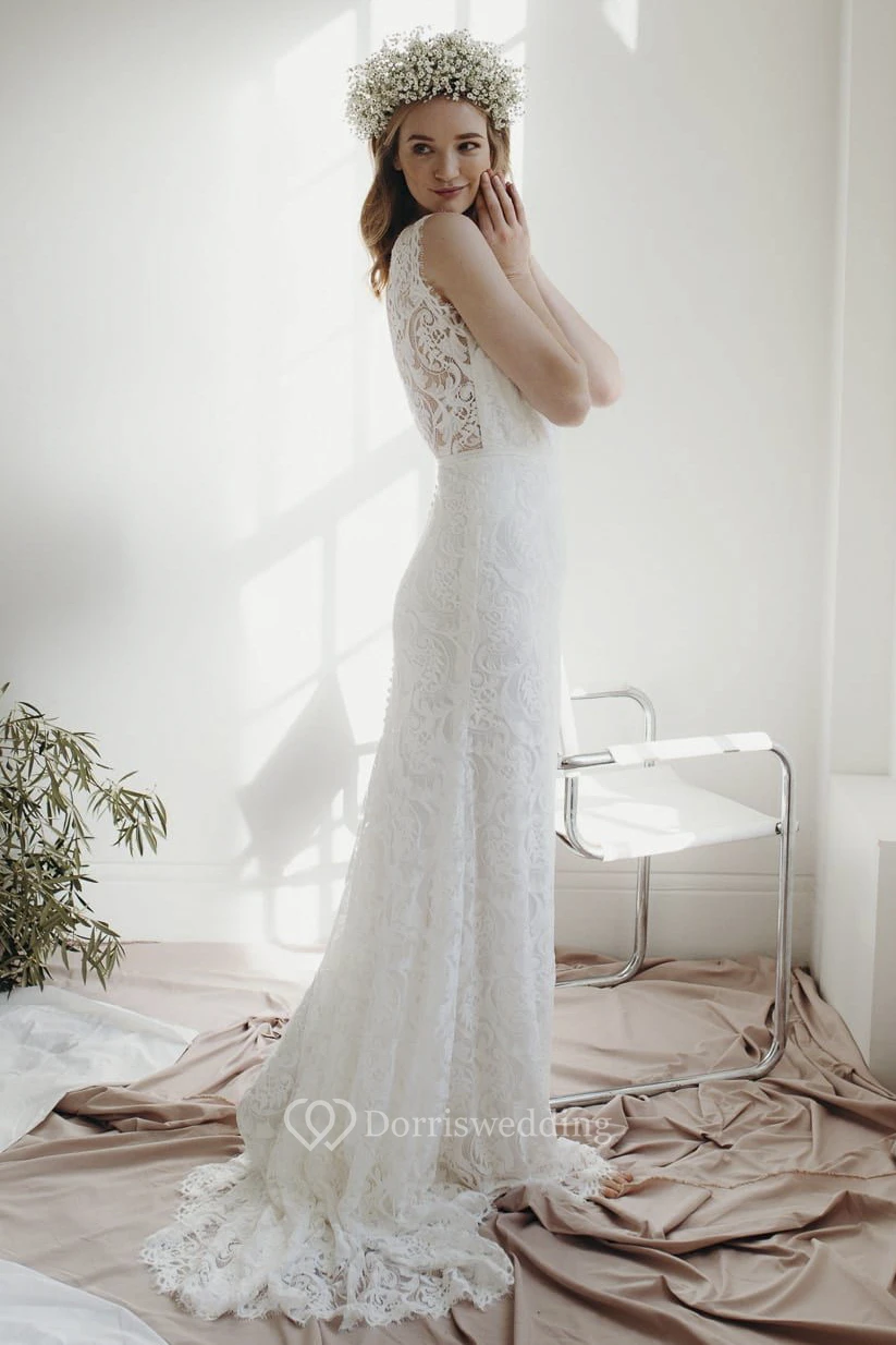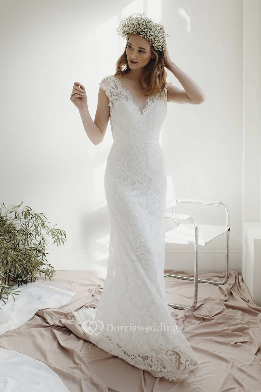 Cap Sleeve Lace Sheath Deep V-neck Wedding Dress With Court Train