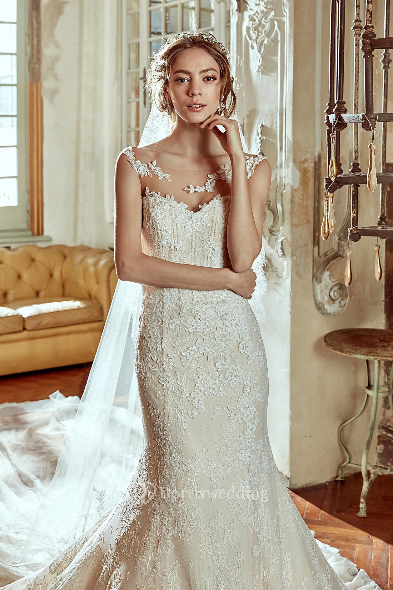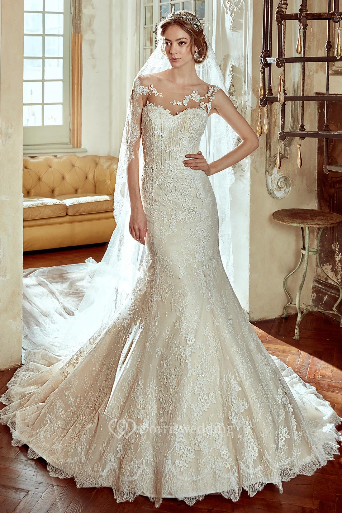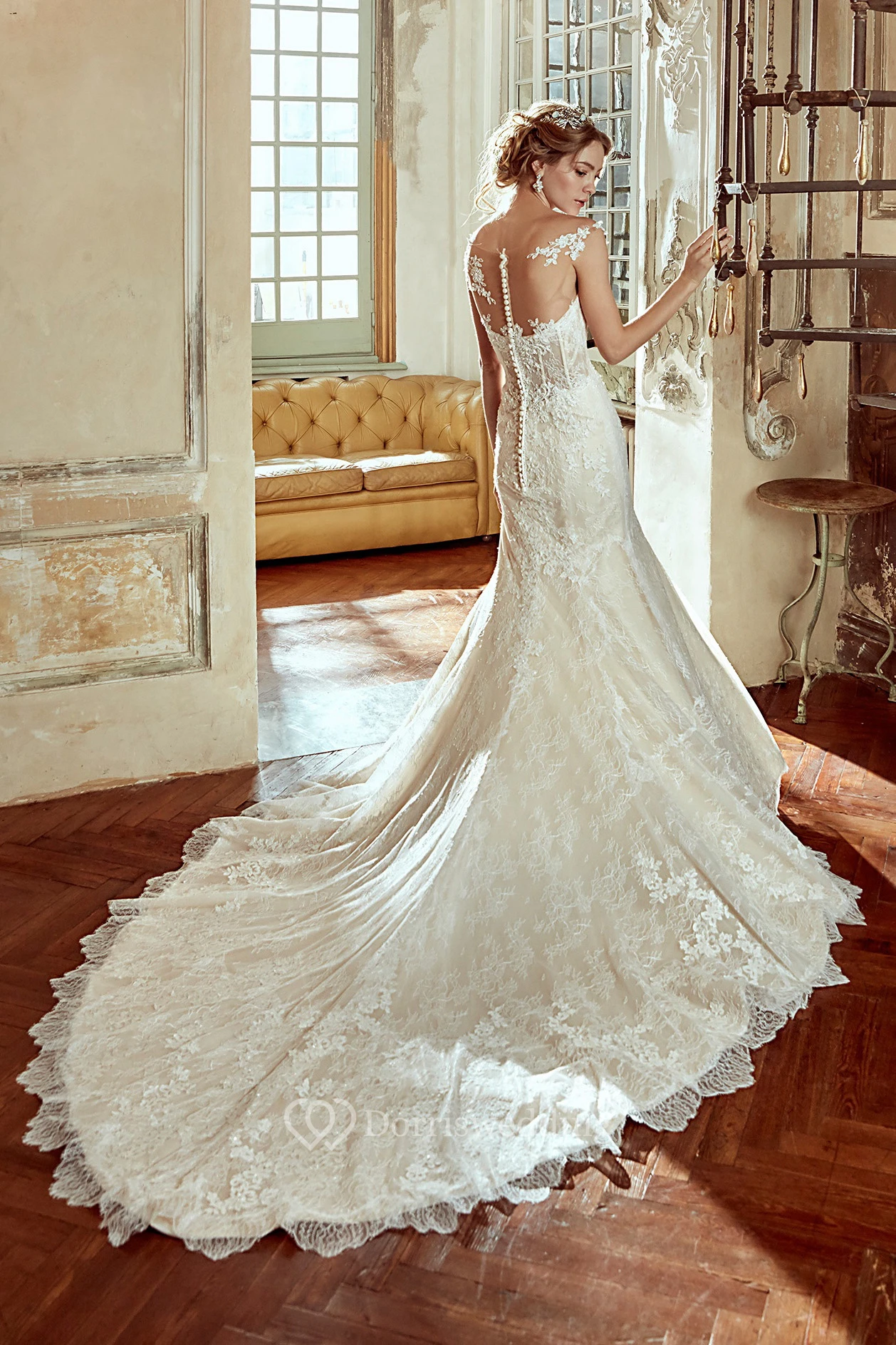 Cap-Sleeve Lace Wedding Dress with Scalloped Train Rim and Appliques