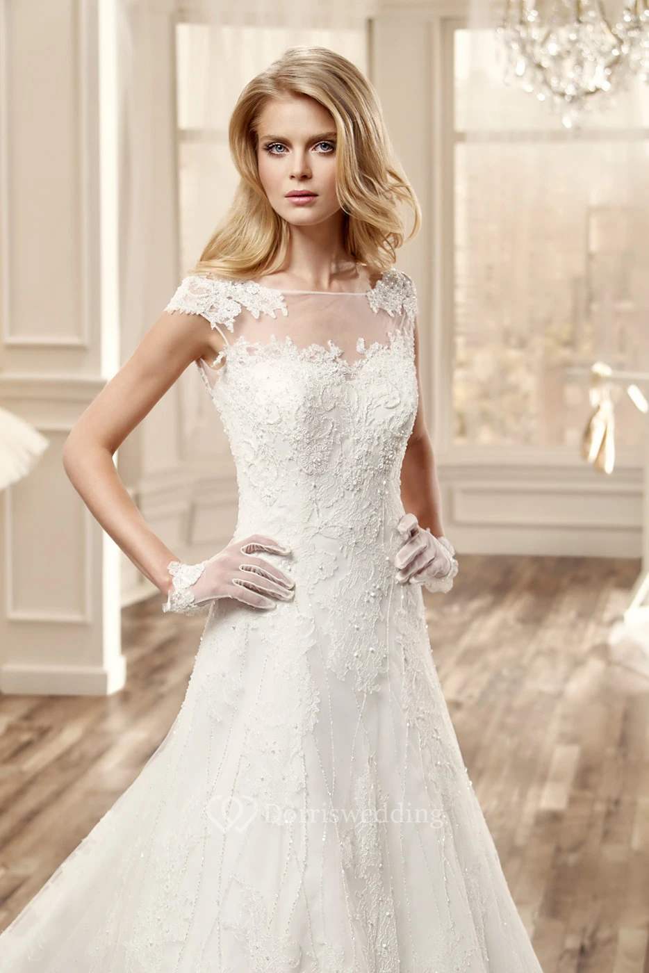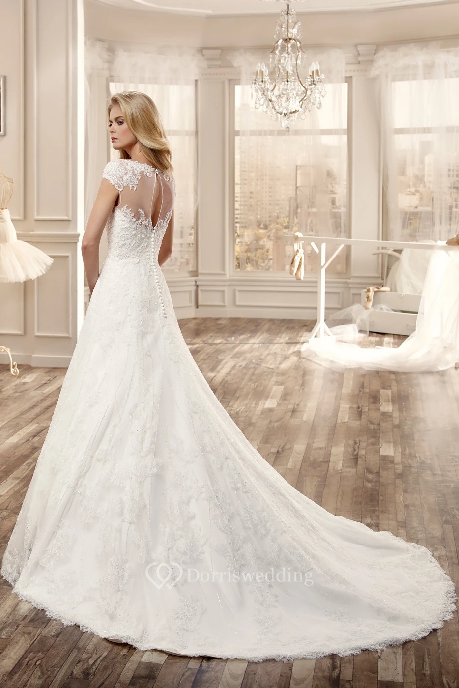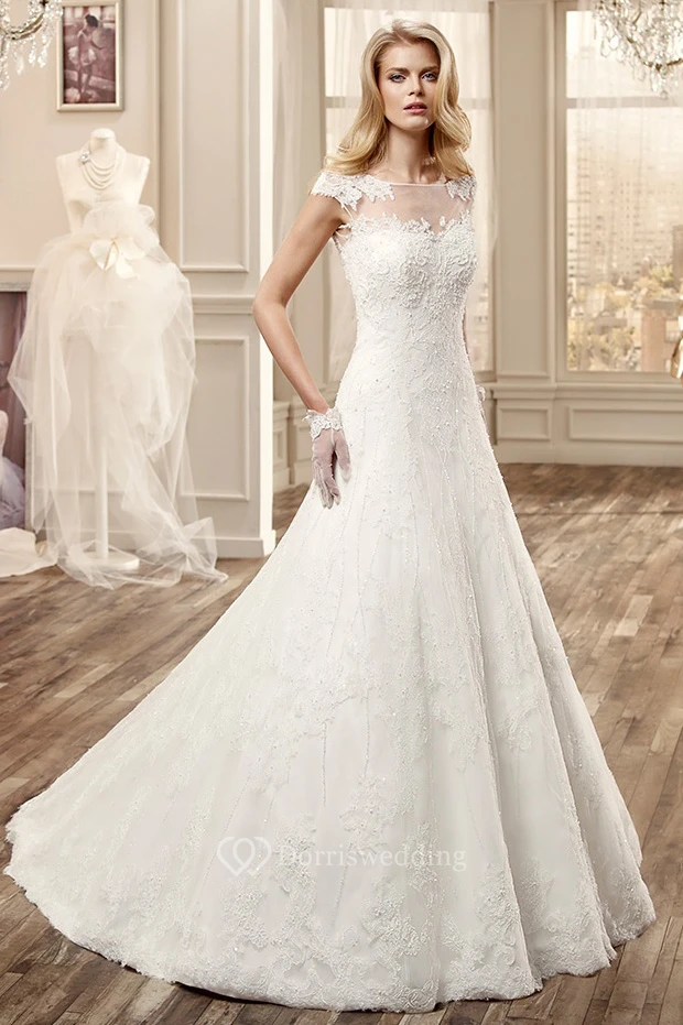 Cap-Sleeve Long Wedding Dress With Illusive Neckline And Court Train