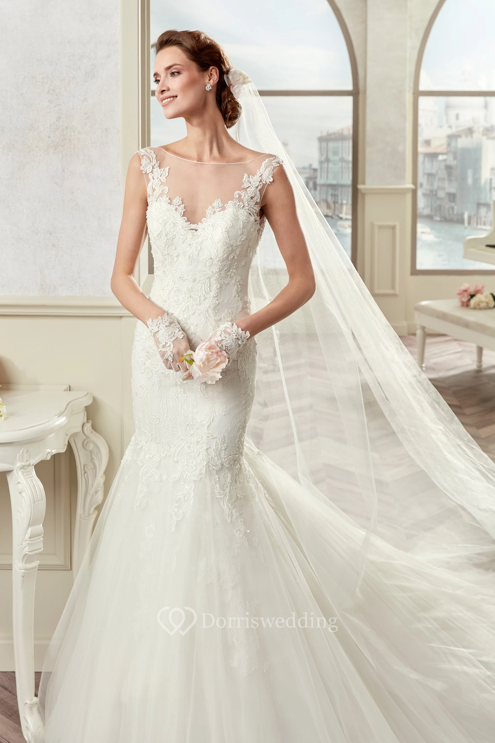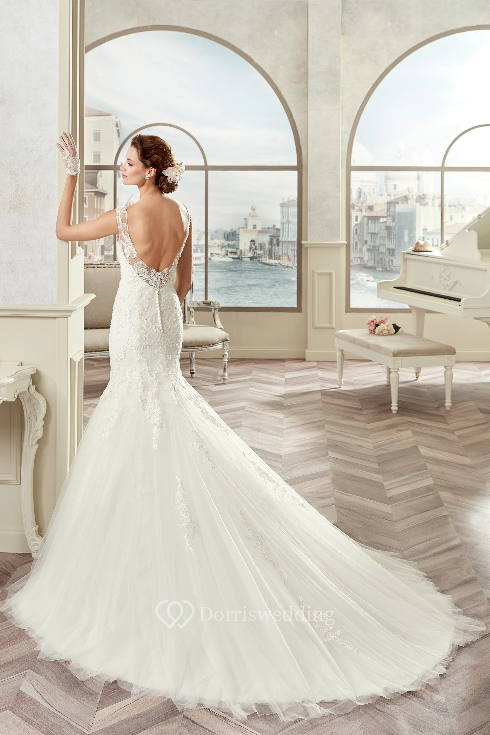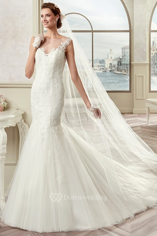 Cap Sleeve Mermaid Bridal Gown With Illusive Design And Open Back