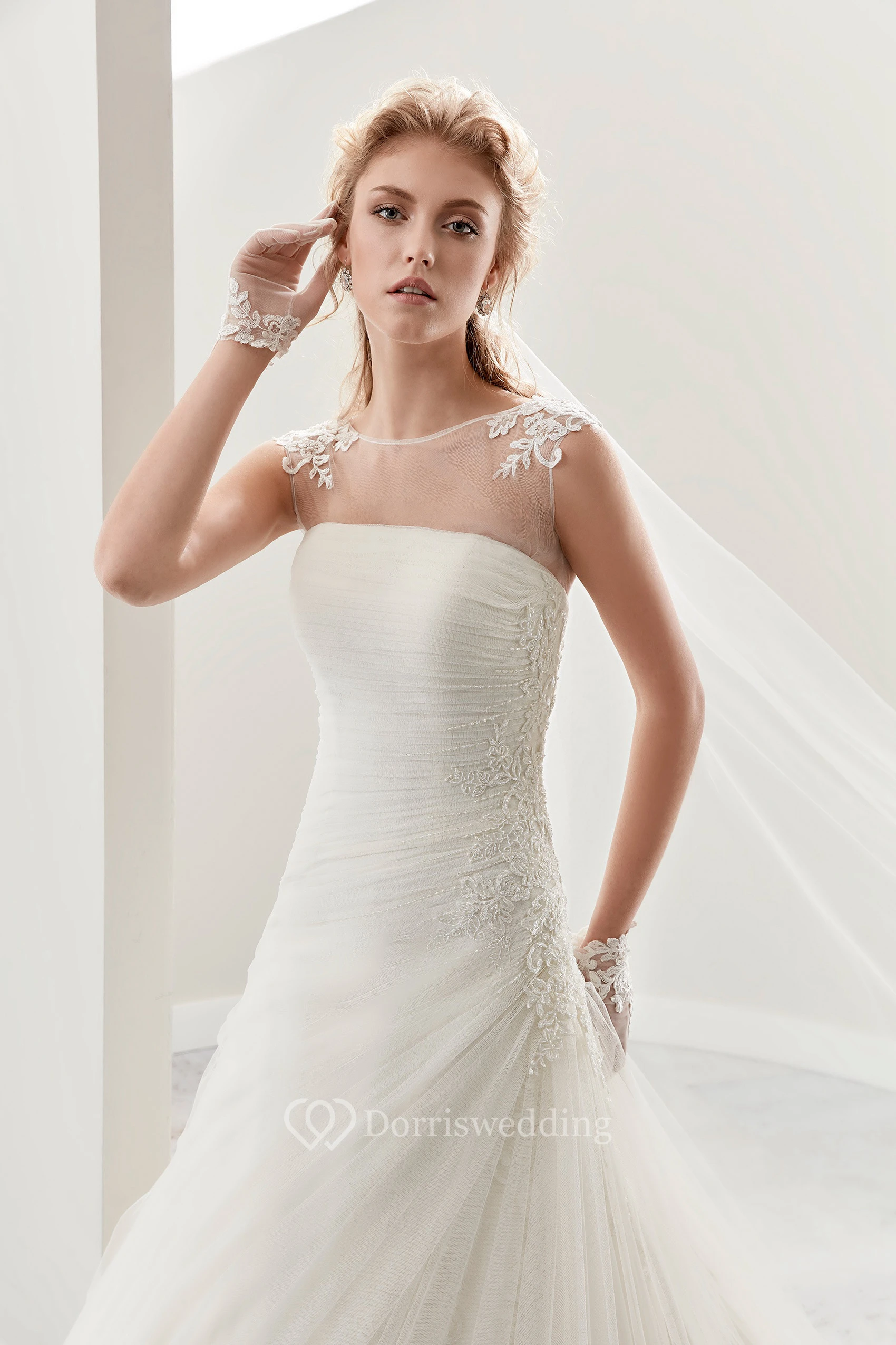 Cap Sleeve Pleated Bridal Gown With Side Draping And Illusion Neckline And Back