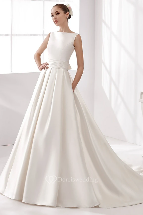 Cap-Sleeve Satin A-Line Wedding Dress With Cinched Waistband And Open Back
