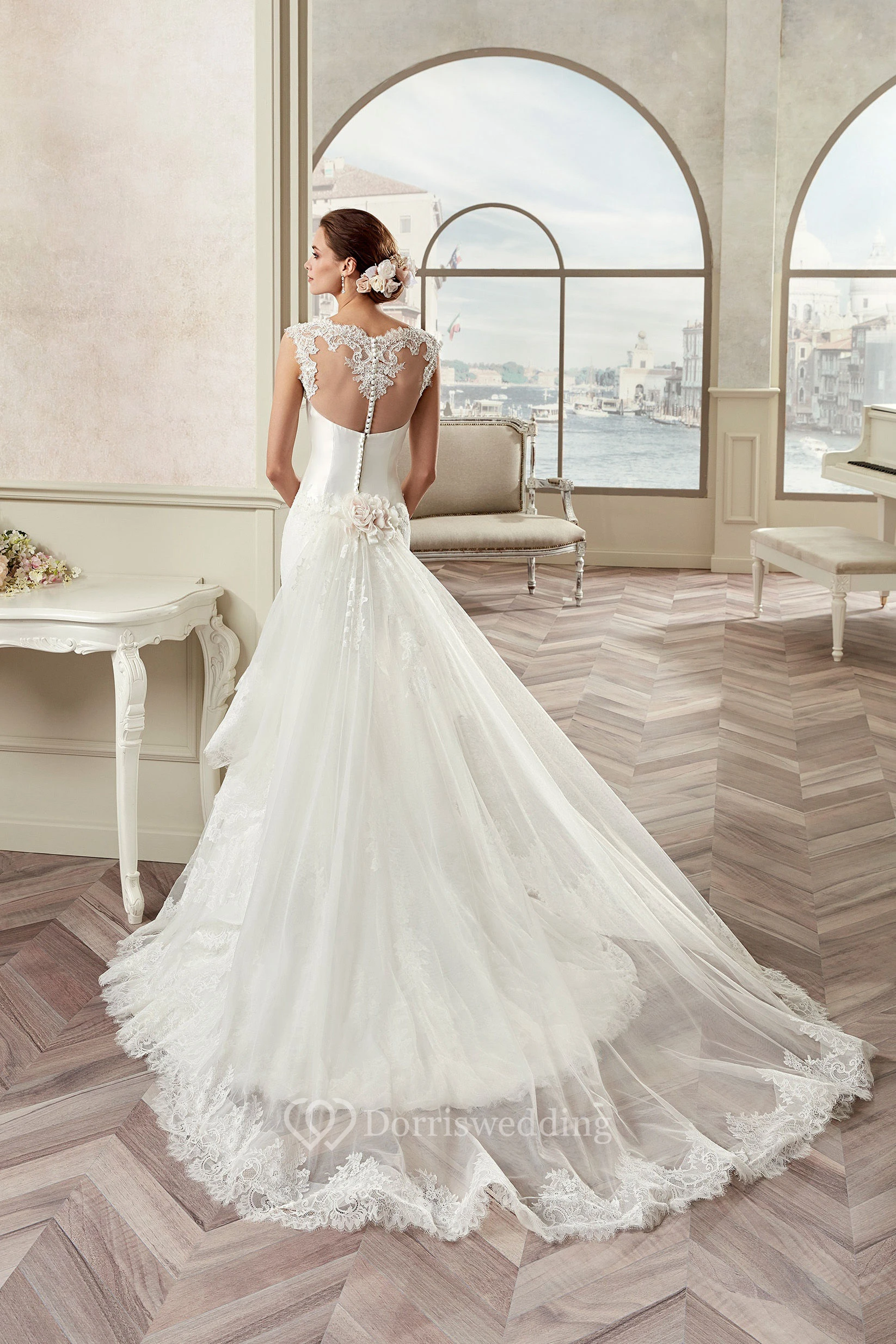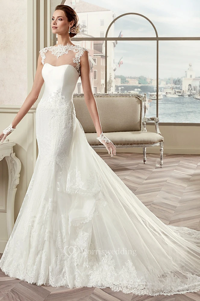 Cap Sleeve Sheath Mermaid Bridal Gown With Illusive Design And Detachable Train