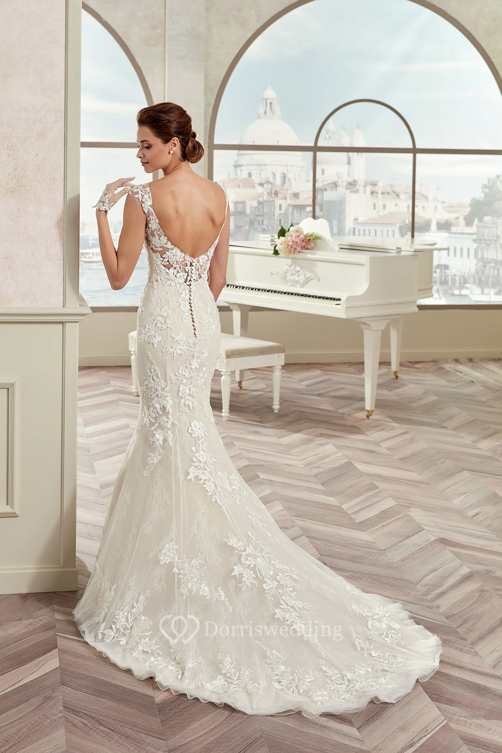 Cap Sleeve Sheath Mermaid Bridal Gown With Illusive Neckline And Open Back