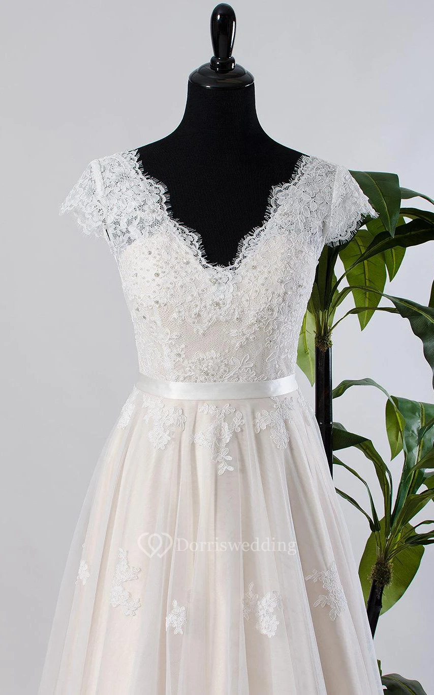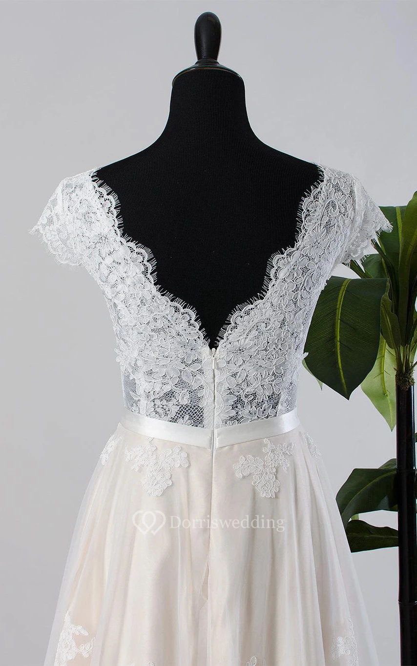 Cap Sleeve Tulle Lace Satin Weddig Dress With Low-V Back