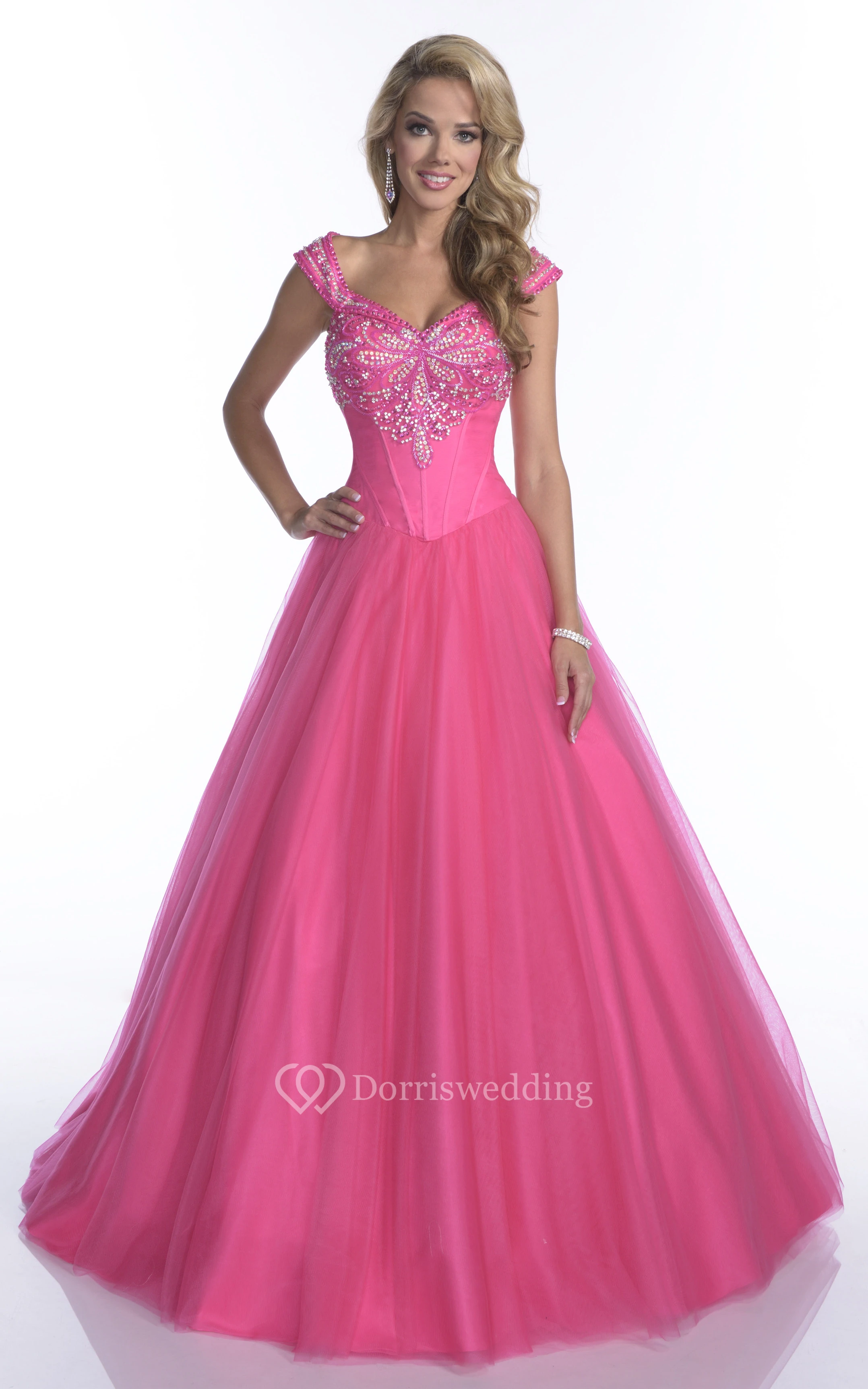 Cap Sleeve Tulle A-Line Quinceanera Dress With Crystal Top