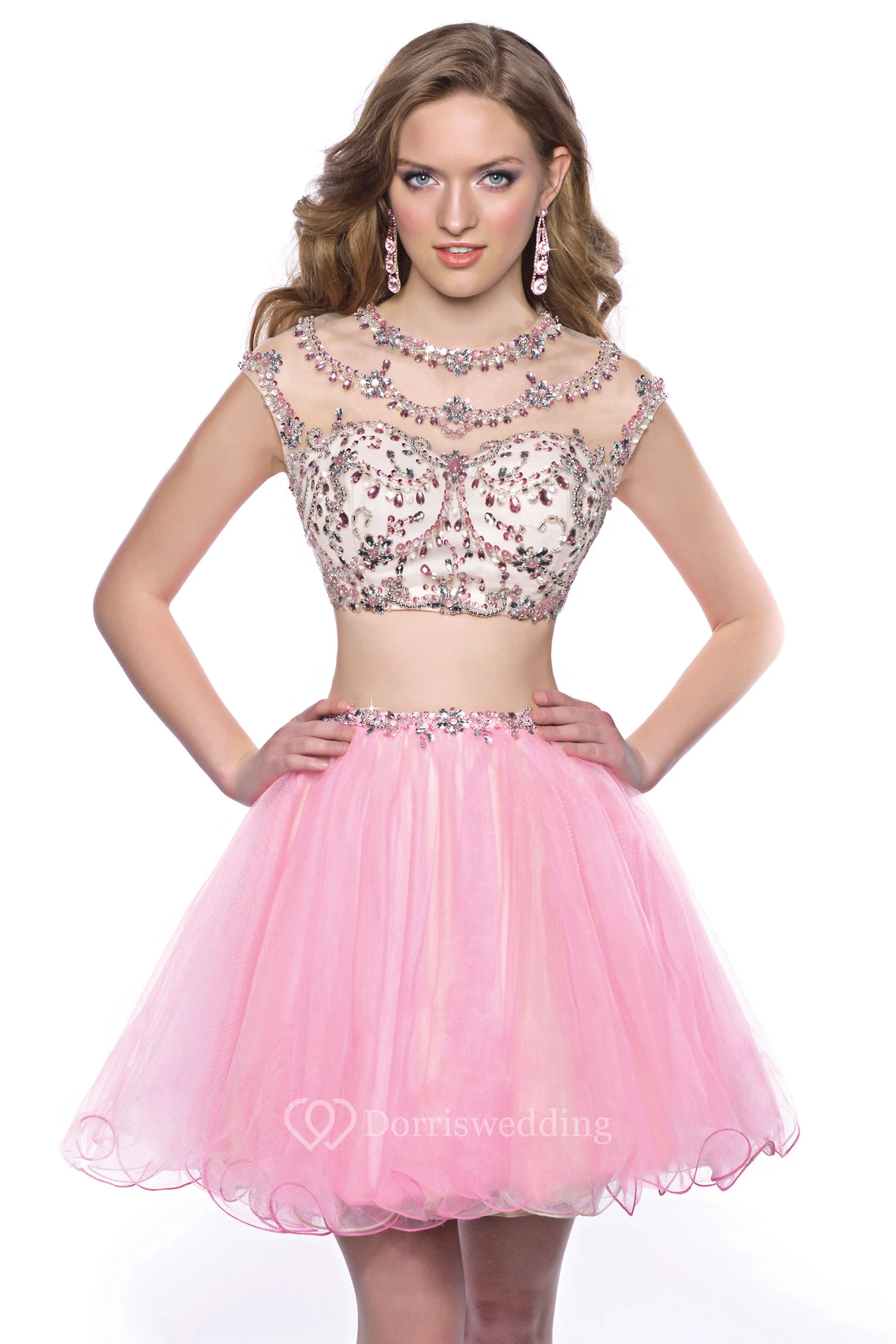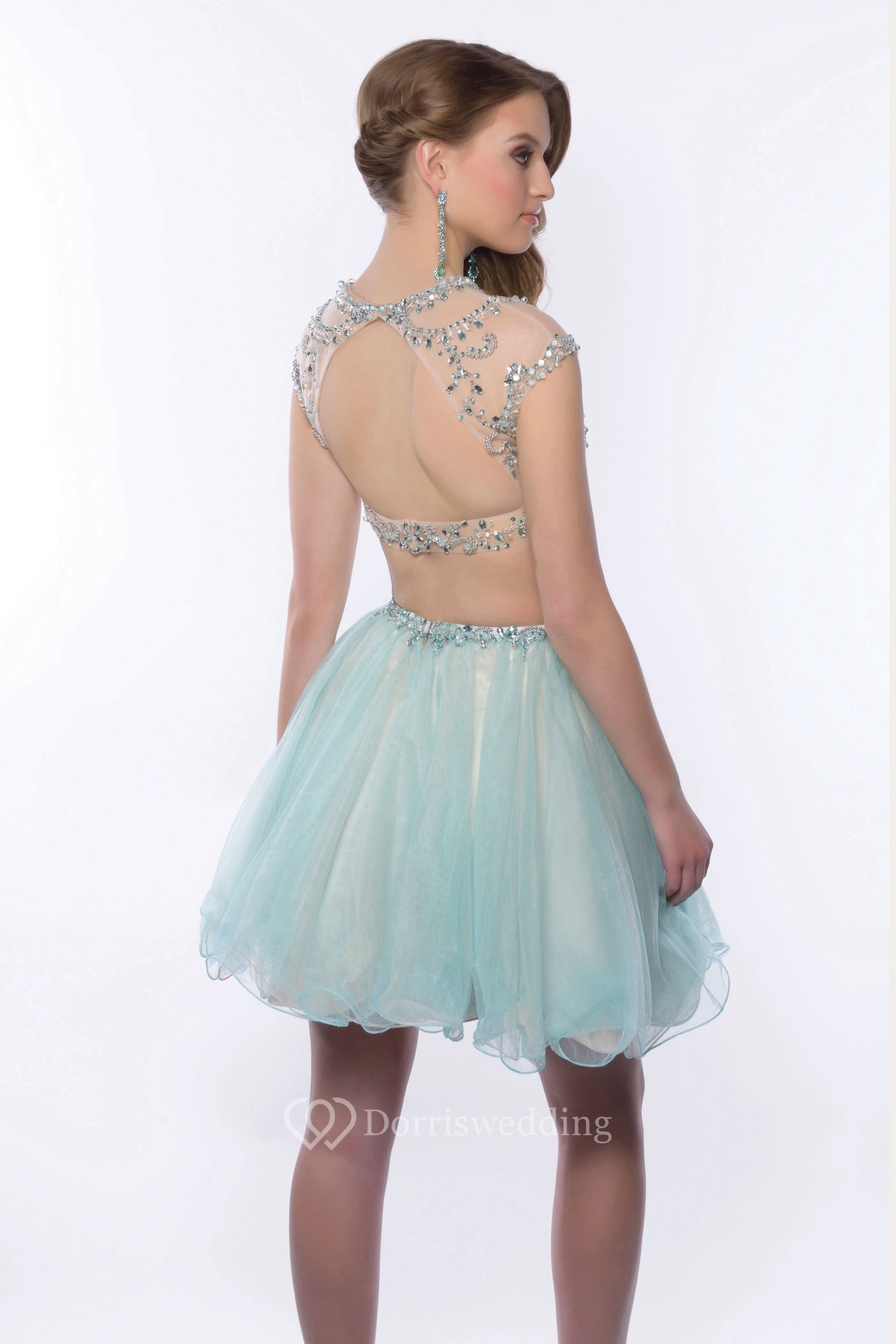 Cap Sleeve Two-Piece Mini Homecoming Dress With Jeweled Top And Tulle Skirt