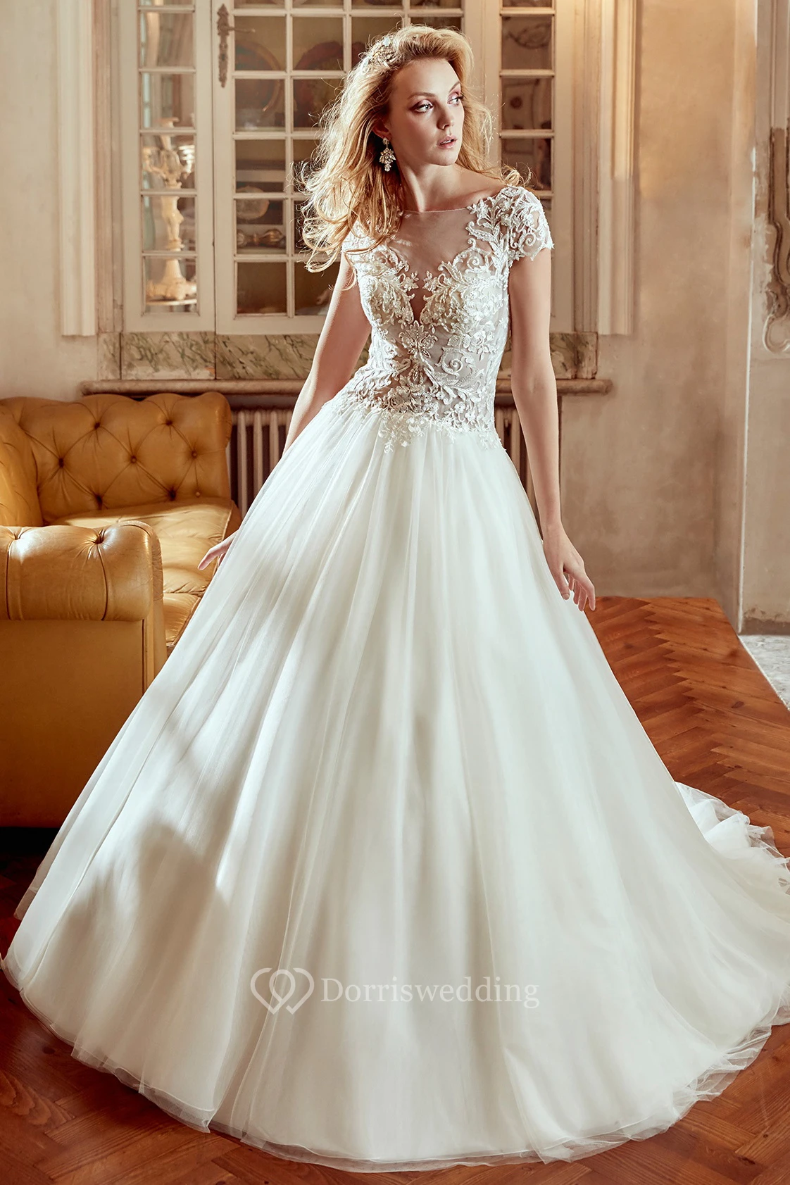 Cap-Sleeve V-Neck A-Line Gown With Lace Bodice And Illusive Back