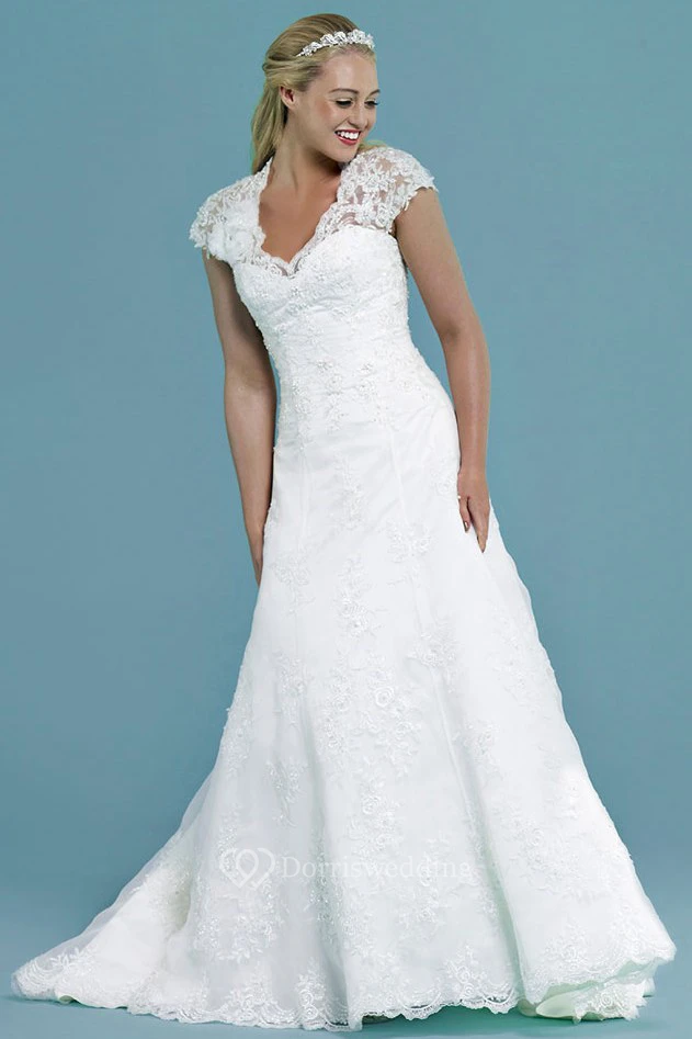 Cap-Sleeve V-Neck Appliqued Long Lace Wedding Dress Styles