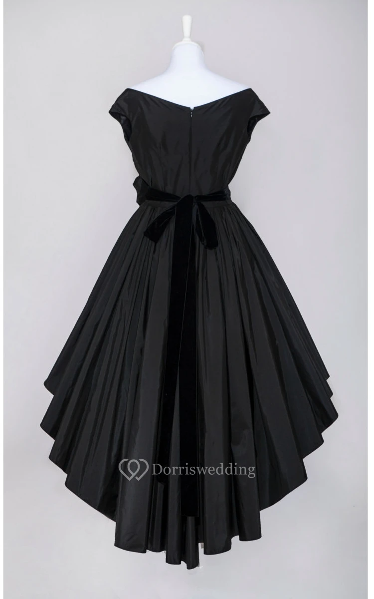 Cap-sleeve V-neck High Low Satin Dress With Flower and Pleats