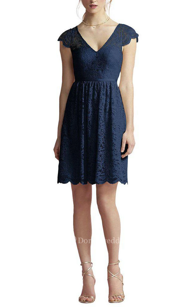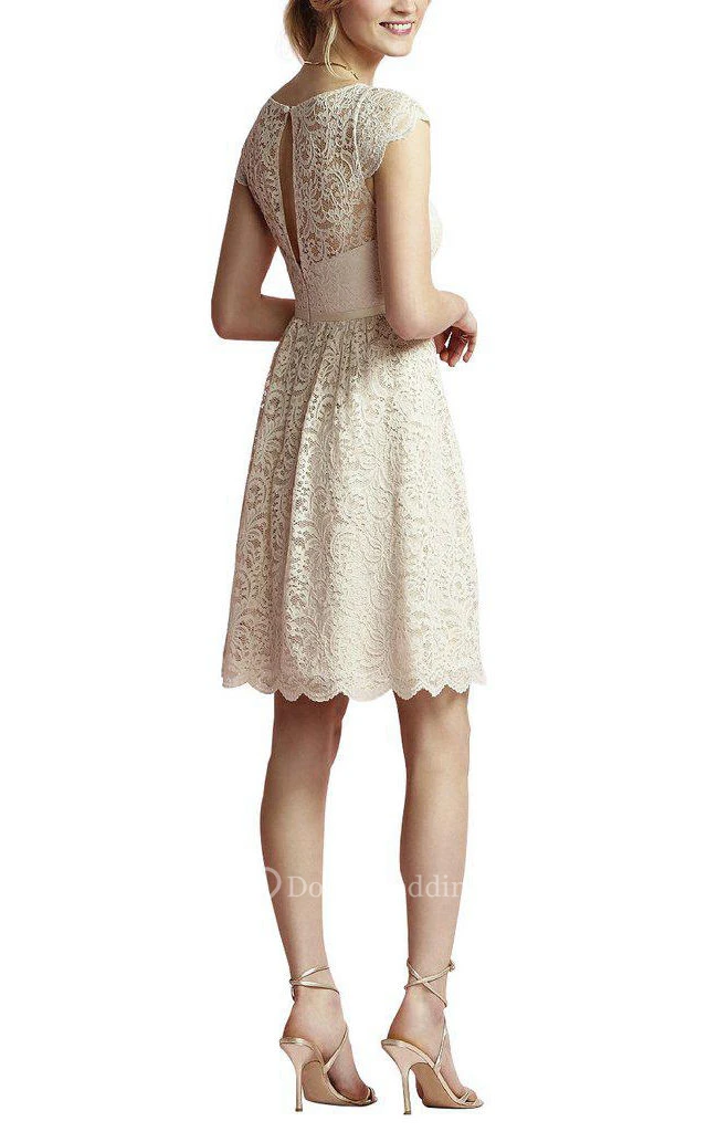 Cap Sleeve V-neck Lace A-line Bridesmaid Dress with Keyhole Back