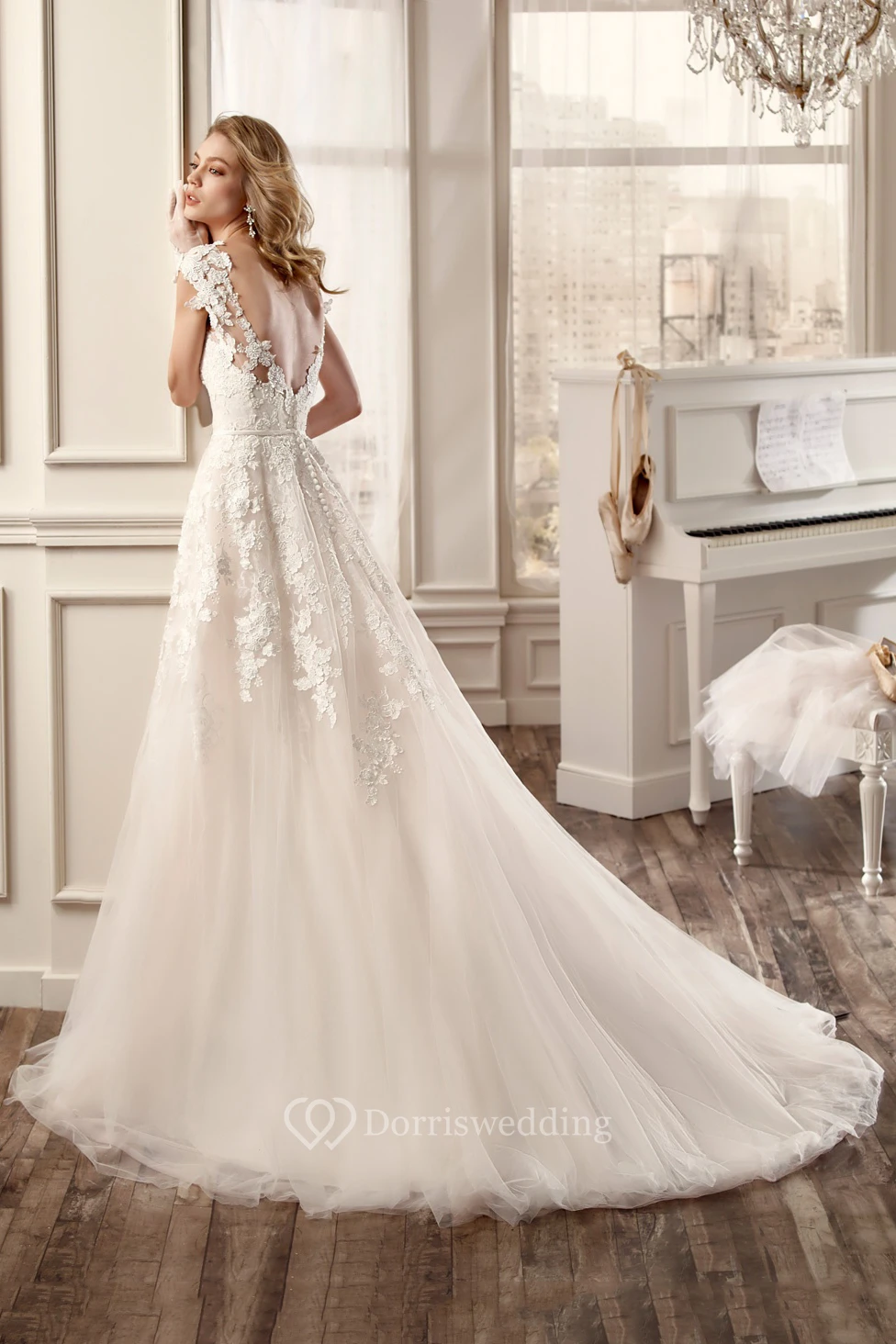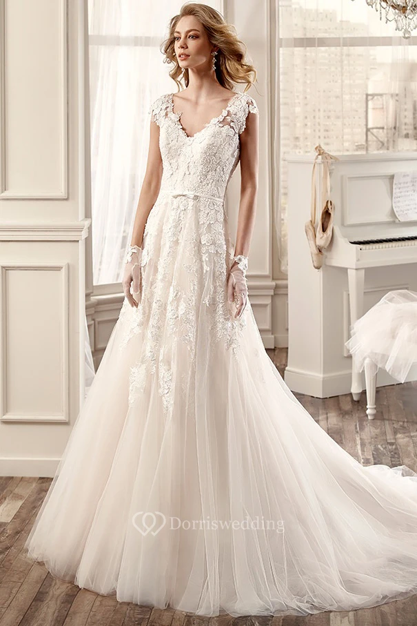 Cap-Sleeve V-Neck Pleating Wedding Dress With Brush Train And Open Back
