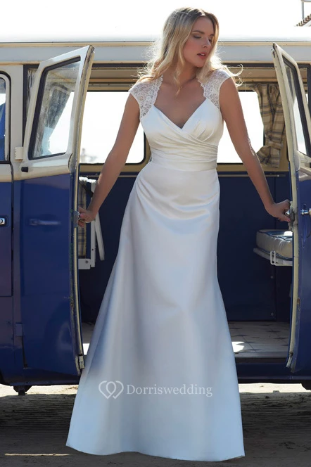 Cap-Sleeve V-Neck Satin Chiffon Wedding Dress With Ruching And Sweep Train