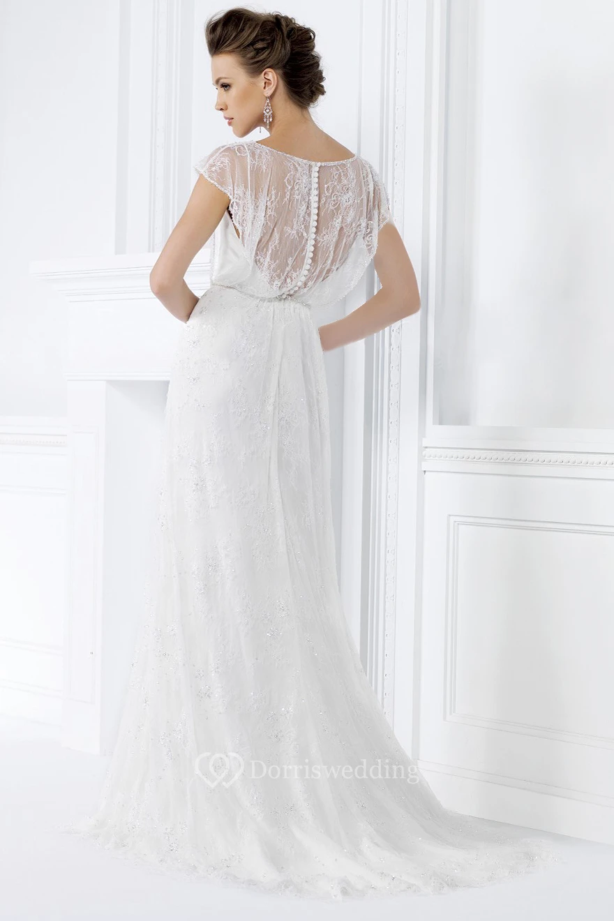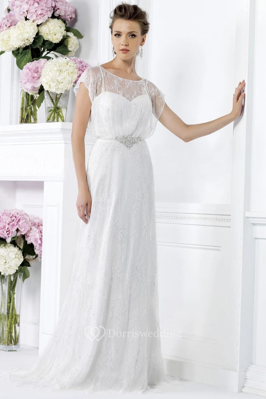 Cap-Sleeved Bateau-Neck Long Gown With Illusion Style And Beaded Waist