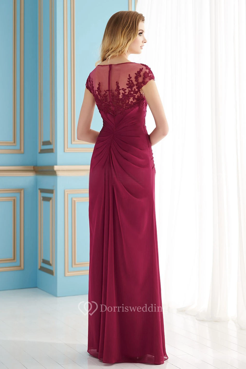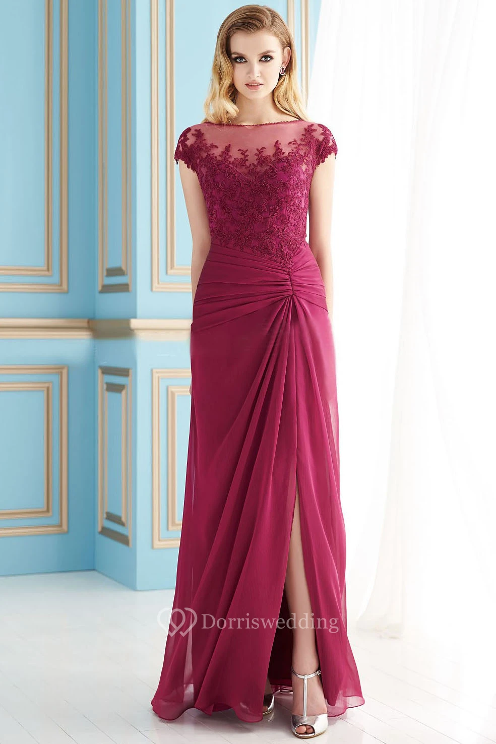 Cap-Sleeved Floor-Length Mother Of The Bride Dress With Front Slit And Lace Detail
