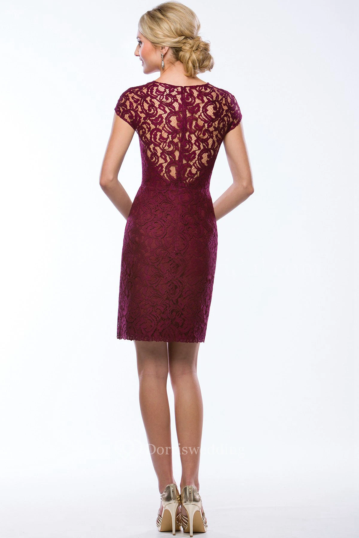Cap-Sleeved High-Neck Short Lace Sheath Bridesmaid Dress With Illusion Style