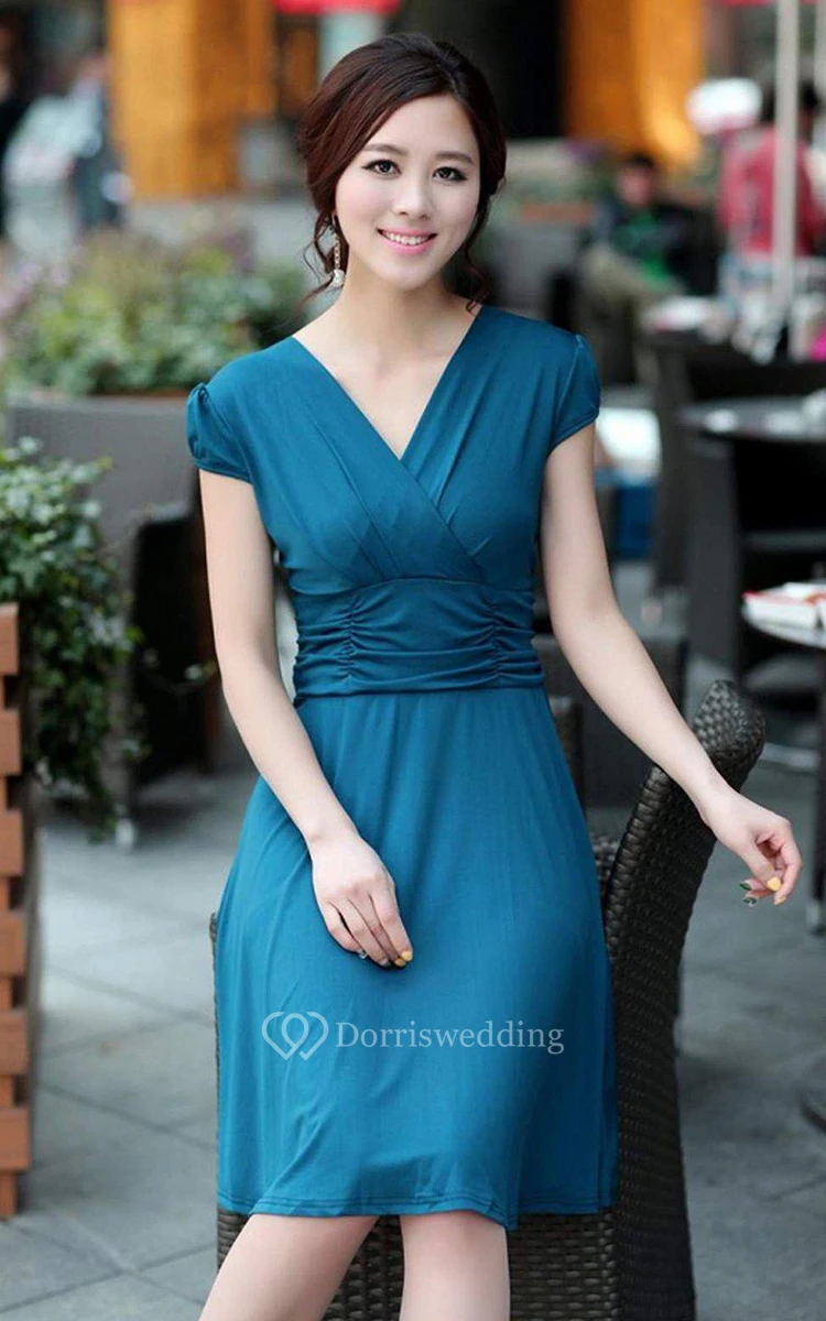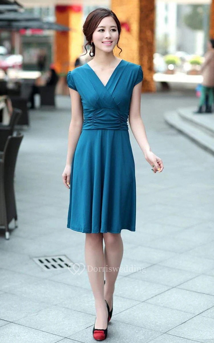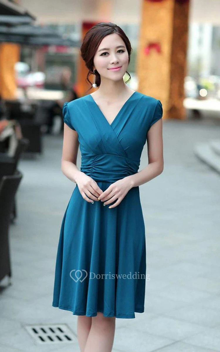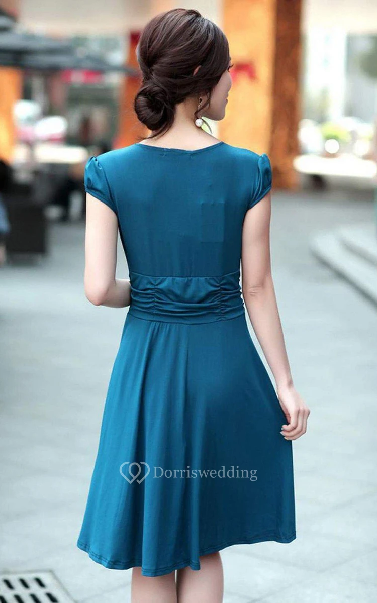 Cap-sleeved Knee-length Dress With Ruching