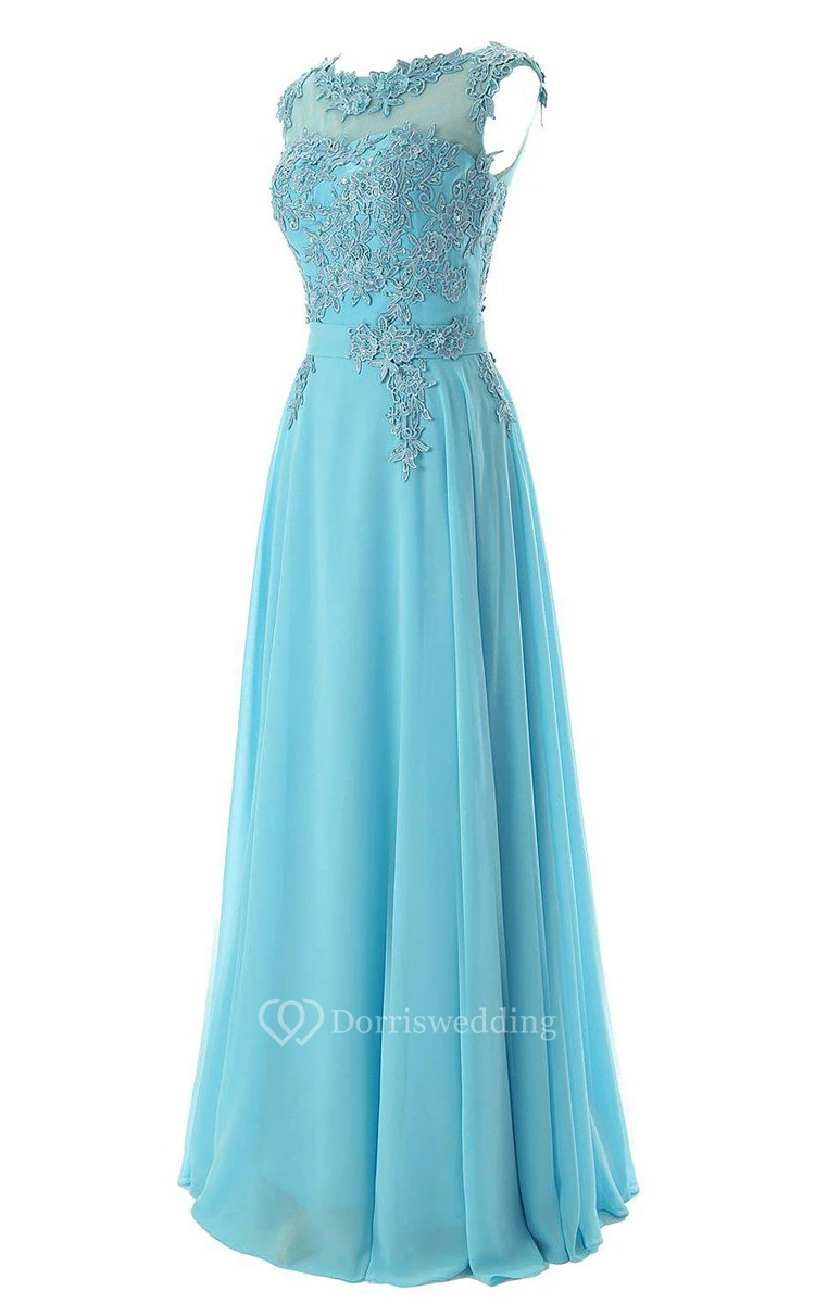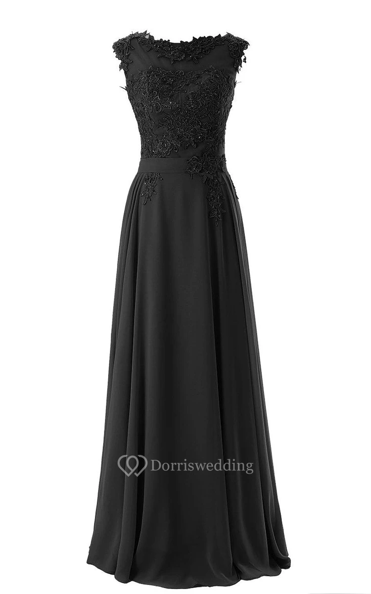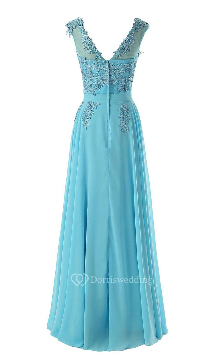 Cap-sleeved Long Chiffon Gown With Lace Bodice