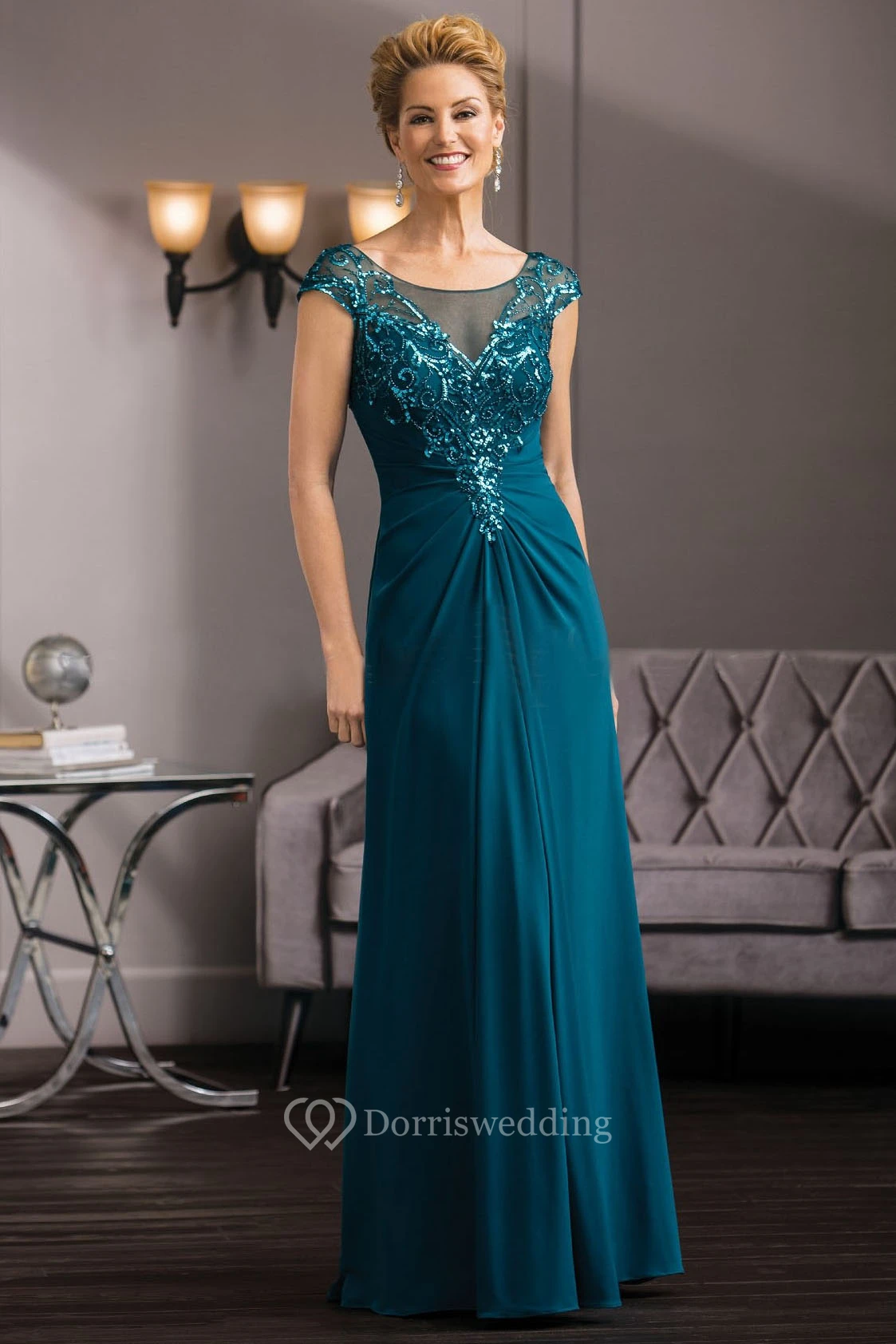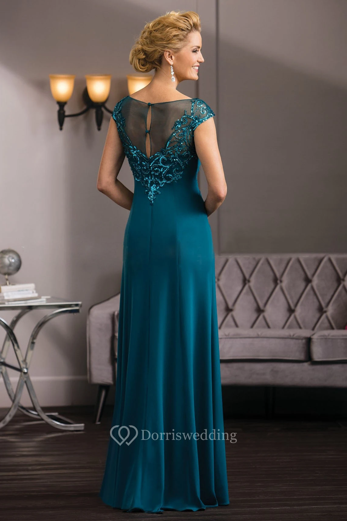 Cap-Sleeved Long Gown With Sequins And Illusion Back