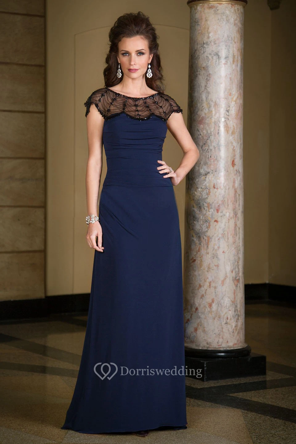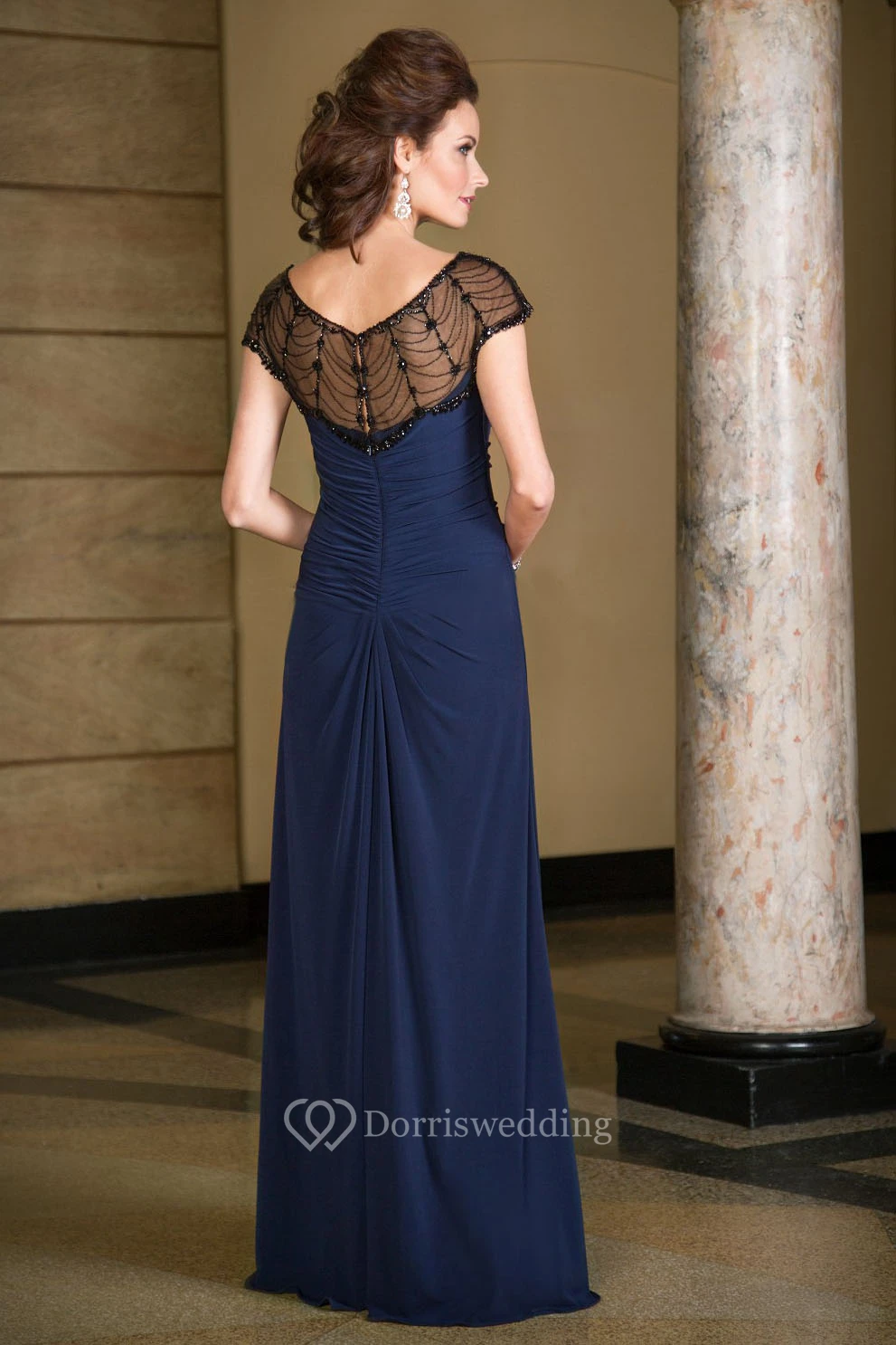 Cap-Sleeved Long Mother Of The Bride Dress With Illusion Beaded Neck