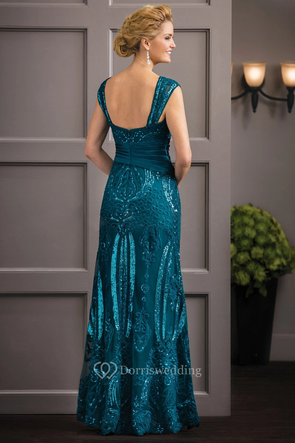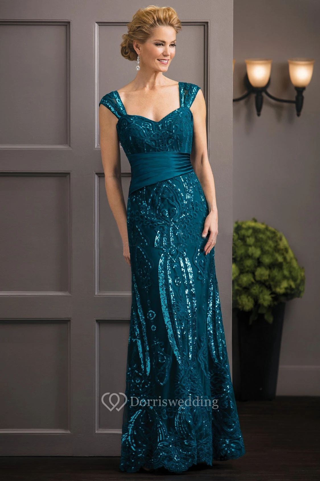 Cap-Sleeved Long Mother Of The Bride Dress With Sequins And Ruches