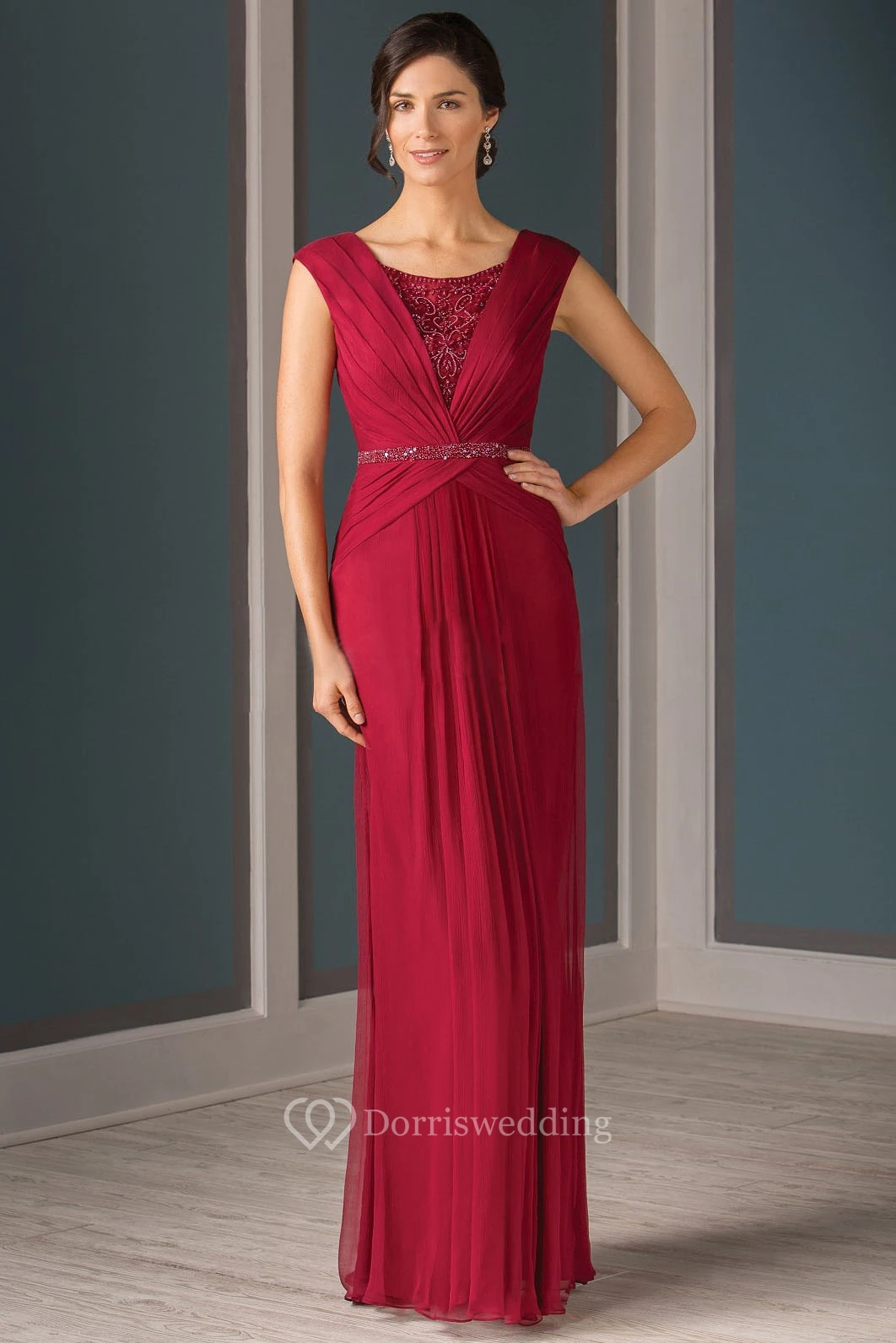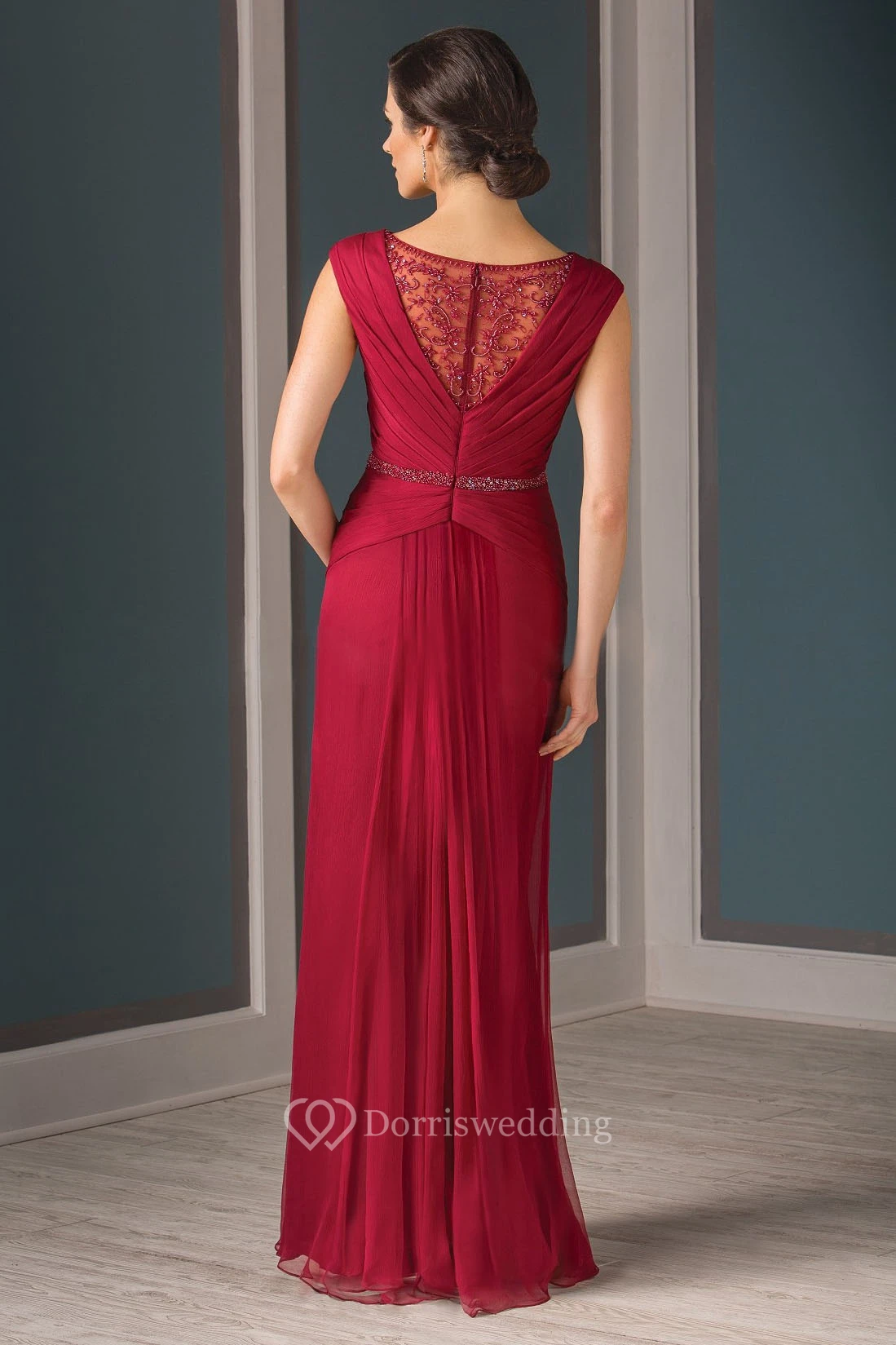 Cap-Sleeved Long Pleated Mother Of The Bride Dress With Crystal Illusion Back