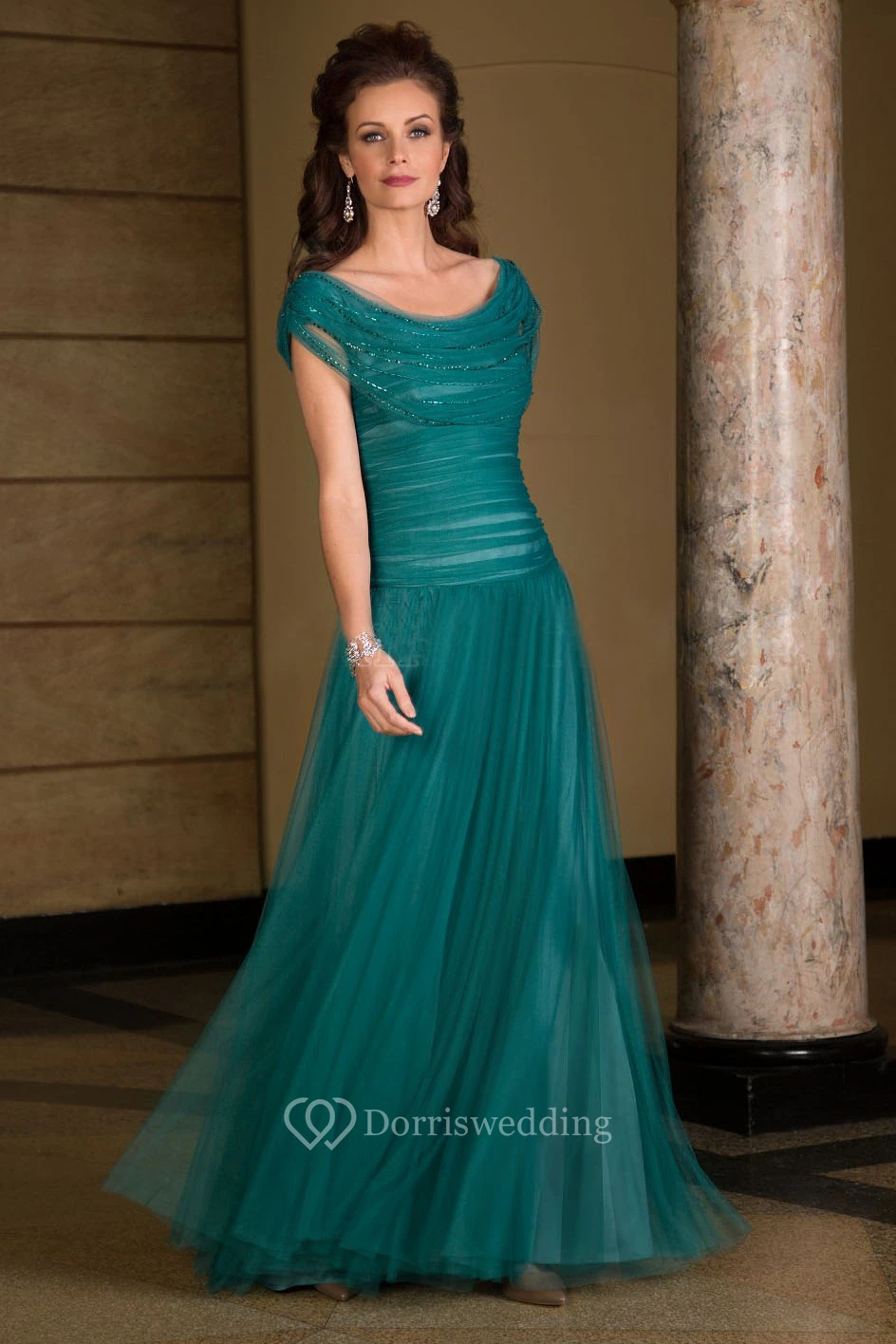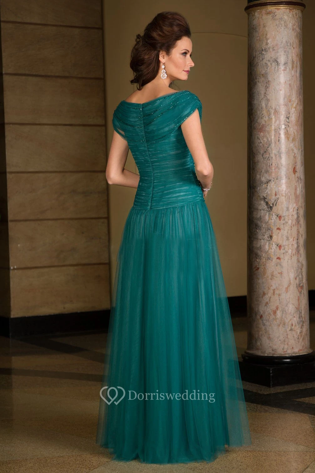 Cap-Sleeved Long Tulle Mother Of The Bride Dress With Ruches And Beadings