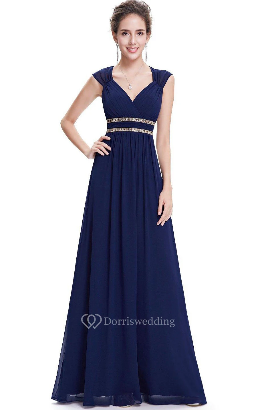 Cap-sleeved V-neck A-line Chiffon Dress with Sequins