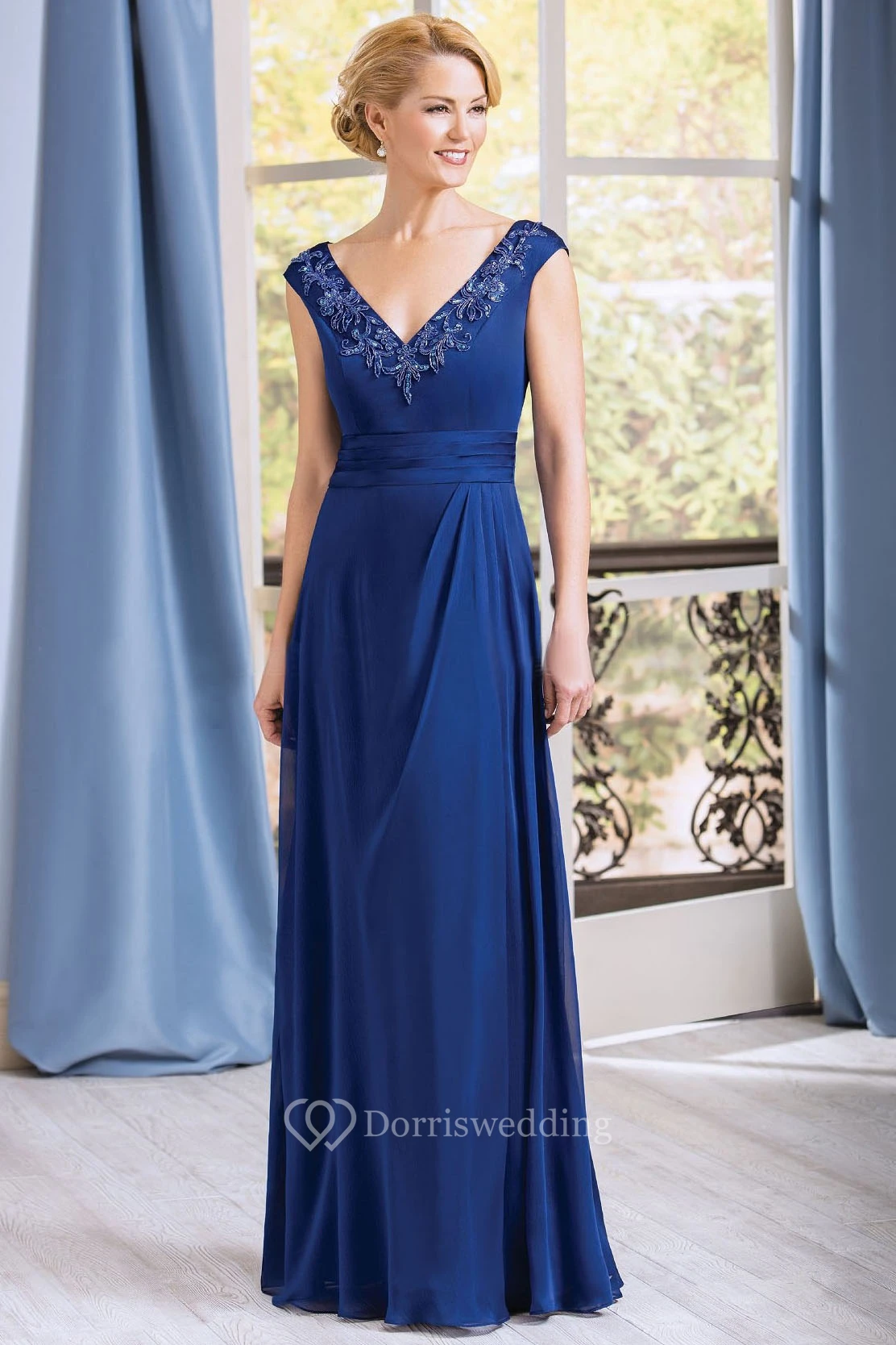 Cap-Sleeved V-Neck A-Line Gown With Appliqued Neckline