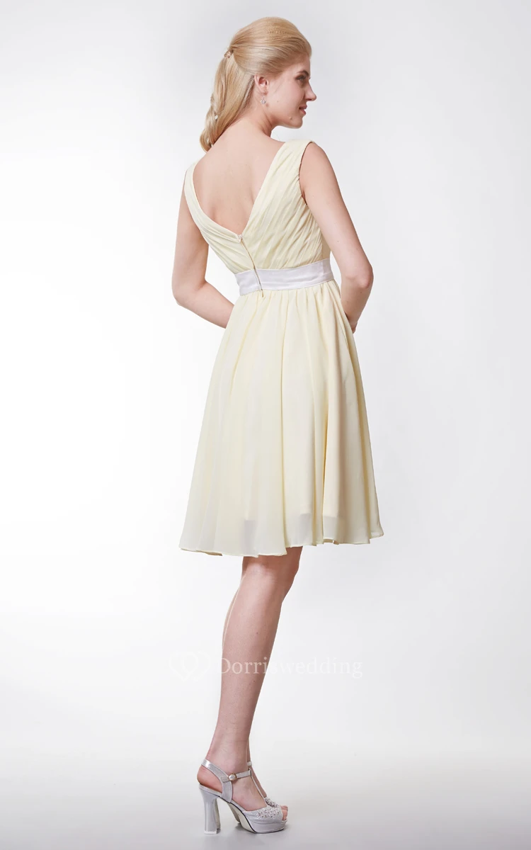 Cap-sleeved V-neck Knee Length Chiffon A-line Dress With Satin Sash