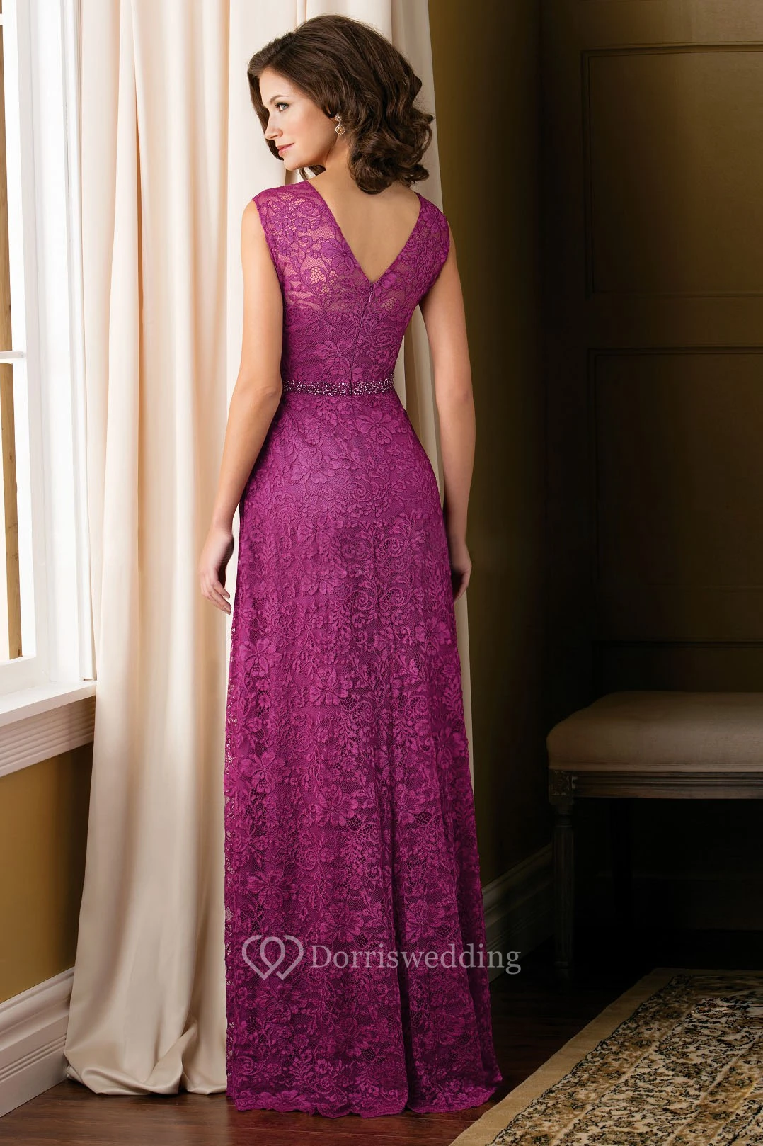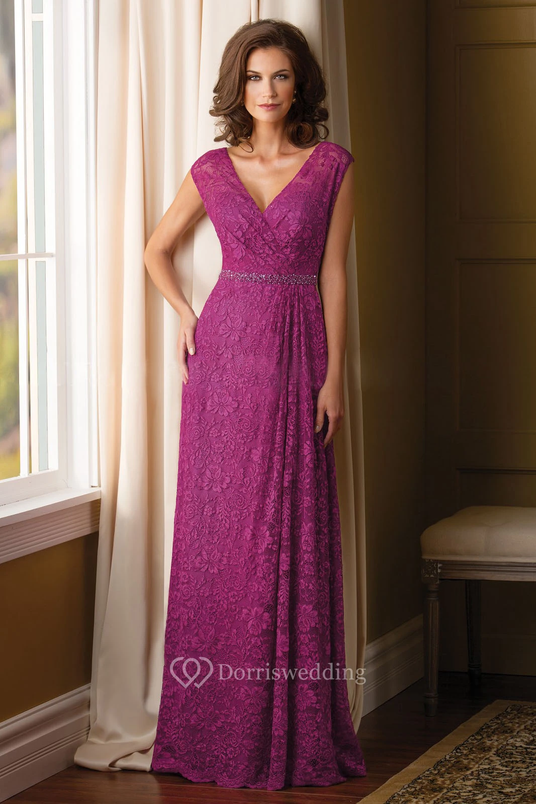 Cap-Sleeved V-Neck Lace Mother Of The Bride Dress With Beadings And V-Back