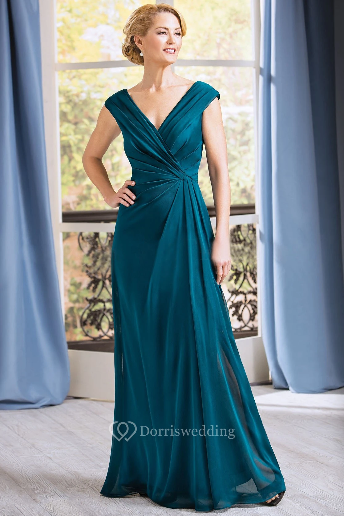 Cap-Sleeved V-Neck Long Gown With Pleats And V-Back