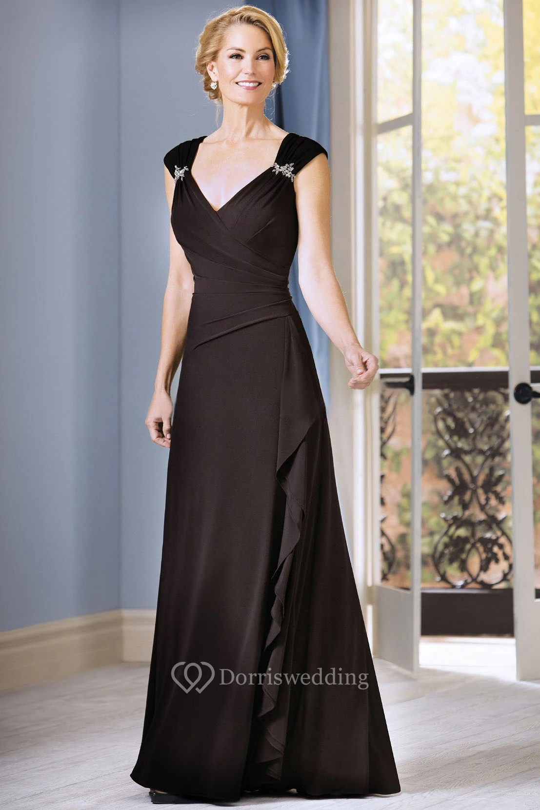 Cap-Sleeved V-Neck Long Mother Of The Bride Dress With Ruffles And Beadings